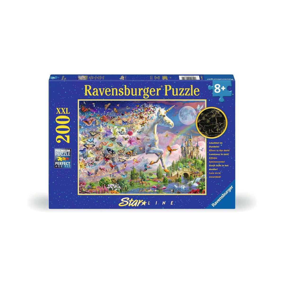 Im Kinderzimmer wird es dunkel... Jedoch nicht ganz! Denn das Star Line Puzzle mit Leuchtfarbe verbreitet einen magischen Schein, selbst wenn das Licht schon längst erloschen ist. Zusätzliche Leuchtfarbe auf der Oberfläche lässt das Motiv hell erstrahlen. Mit 200 Teilen im XXL-Format sind sie ideal geeignet für Kinder ab 8 Jahren. Mit den Ravensburger Glue Sheets fixiert, lassen sich die Star Line Leuchtpuzzles ganz einfach aufhängen und geleiten die kleinen Puzzler und Puzzlerinnen Nacht für Nacht ins Land der Träume. Die Motive wurden speziell für den Leuchteffekte entwickelt. Die Auswahl der richtigen Motive und die hohe Qualität unserer Kinderpuzzles liegen uns sehr am Herzen. Deshalb wird die Unbedenklichkeit aller Materialien sowie der phosphoreszierenden Leuchtfarbe von einem unabhängigen Institut bestätigt. Seit mehr als 100 Jahren entwickeln wir Puzzles, wie Kinder sie lieben: altersgerecht in Motiv, Teilezahl und -größe. Hinweis: Für die volle Leuchtkraft das Puzzle eine Minute mit einer hellen Lichtquelle anstrahlen. Der maximale Leuchteffekt dauert ein paar Minuten an und lässt dann langsam nach..