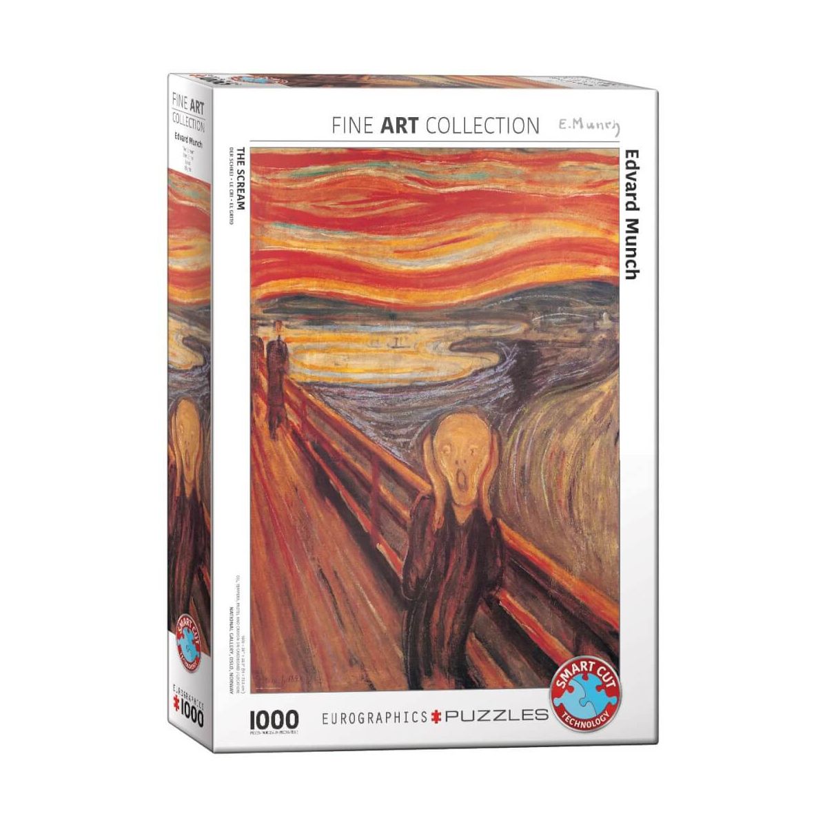 EuroGraphics The Scream von Edvard Munch 1000-teiliges Puzzle. Kartongröße: 35 x 25 x 5,8 cm. Fertige Puzzle Größe: 48 x 68 cm. Der Schrei ist der populäre Name für jede der vier Versionen einer Komposition, die der expressionistische Künstler Edvard Munch zwischen 1893 und 1910 sowohl als Gemälde als auch als Pastell geschaffen hat. Starke, hochwertige Puzzleteile. Hergestellt aus recyceltem Karton und bedruckt mit Tinte auf pflanzlicher Basis. Dieses hochwertige Puzzle wird alle gleichzeitig begeistern und erziehen.