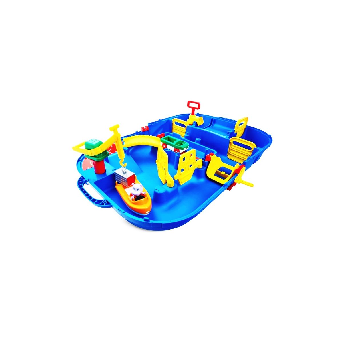 Die AquaPlay LockBox ist Wasserbahn und Transportbox in einem. Durch die zwei enthaltenen Verbindungsklammern ist sie im Handumdrehen aufgebaut und bietet auf einer Länge von 85 cm mit Schleuße und Containerhafen eine große Wasserspielwelt. Gemeinsam mit der Spielfigur Wilma, dem Hippo, entdecken Kinder ab drei Ja hren spielerisch das Element Wasser, lernen wie Strömungen entstehen u nd sich deren Richtung bestimmen lässt und Wasser Gegenstände anhebt und transportiert. Besonderen Spaß bereitet die Schleuse mit Pumpe. Sin d die Tore geschlossen, lässt sichdas Boot durch Pumpen nach oben bewegen und fährt schnell beim Öffnender Schleuse wieder heraus. Auf der gegenüberliegenden Seite befindetsich das Hafenbecken mit großem Con tainerkran. Hier können das Containerboot und das Amphibienfahrzeug sc hnell be- und entladen werden. Durch die Handkurbel mit extra großen P addelflächen lassen sich kinderleicht Strömungen erzeugen, so dass die Boote leicht durch die breiten Kanäle fahren können. Nach Spielende w ird die AquaPlay LockBox zusammengeklappt und die beiden Bahnhälften d urch die enthaltenen Clips sicher verbunden. Die Öffnungen lassen sich leicht durch die enthaltenen Toreverschließen. So lässt sich die Bah n problemlos zu Ausflügen oder in den Urlaub mitgenehmen oder sicher b is zum nächsten Sonnentag verstauen. Die AquaPlay LockBox wird in Deut schland hergestellt und lässt sichleicht mit anderen AquaPlay-Spielsets und Erweiterungen kombinieren. Verpackt ist die LockBox mit einer b unt bedruckten Banderole mit detaillierten Beschreibungen zum Produkt und den Spielmöglichkeiten. Mehr Informationen zum Produkt finden Sie unter www.aquaplay.com..
