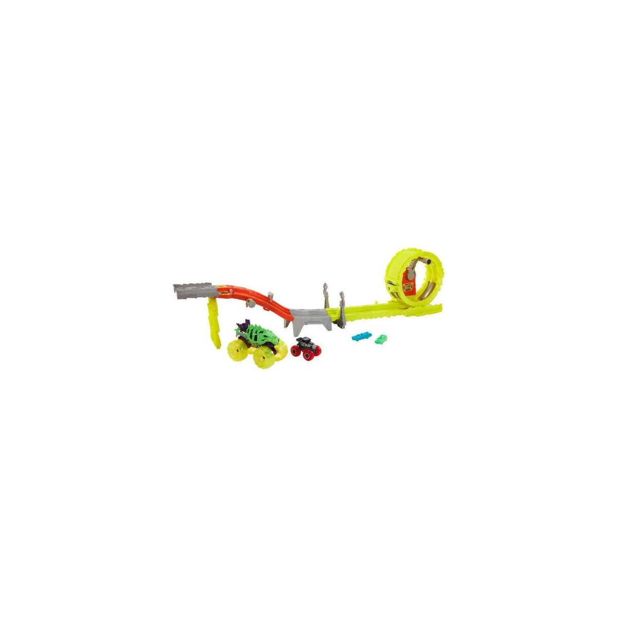 Ein extragroßer Skelesaurus und 1 Bone Shaker im Maßstab 1:64 stellen sich in einem Rennen, um Zerstörung zu vermeiden. Die beiden Fahrzeuge können mit dem Ein- Ausschalter gestartet werden, um zu sehen, ob der Bone Shaker bei einem Rennen den Hügel hinab in Richtung eines riesigen Loopings den Bösewicht schlagen kann. Es wird nach dem Zufallesrinzip eines von zwei Ergebnissen ausgewählt: Der Bone Shaker schafft es durch den Looping und entkommt, während der Skelesaurus auf der Strecke bleibt. Oder der Skelesaurus fängt seine Beute und setzt den Bone Shaker im Looping fest, sodass er umfällt. Das Set enthält zwei zerdrückte Autos für noch mehr Zerstörung. Abweichungen in Farbe und Gestaltung vorbehalten..