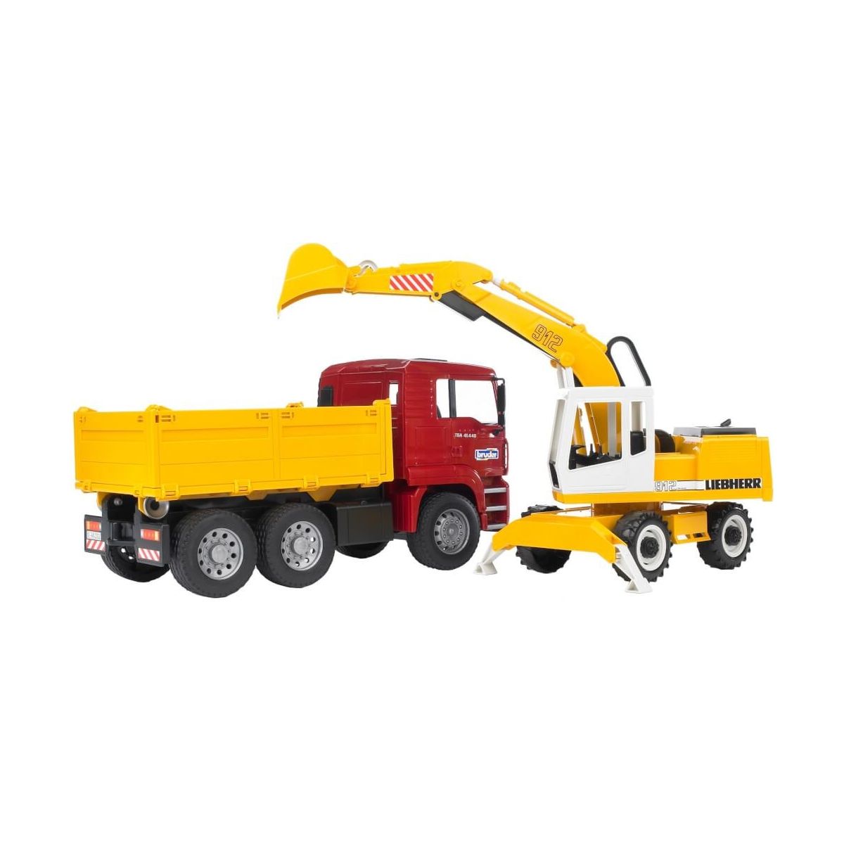 Erde mit dem Bagger bewegen, damit den Kippanhänger beladen und direkt abtransportieren. All das geht mit diesem Set, bestehend aus Liebherr Bagger und MAN Kipplaster, im Handumdrehen. Die Bordwände des Kipplastwagens sind nach drei Seiten klappbar, um die transportierte Last in alle drei Richtungen abladen zu können. Zudem kann die Mulde gekippt und arretiert werden. Der Baggerarm des Liebherr Schaufelbaggers ist voll funktionsfähig und der Bagger kann um 360° auf dem Unterwagen gedreht werden, wobei zwei Stützen sicheren Stand bieten. Um die Spielmöglichkeiten zu erweitern, kann der Kipplastwagen mit dem Light and Sound Module (Art.-Nr.: 02801) durch einfaches Aufstecken des Moduls ausgestattet werden (nicht im Lieferumfang enthalten)..