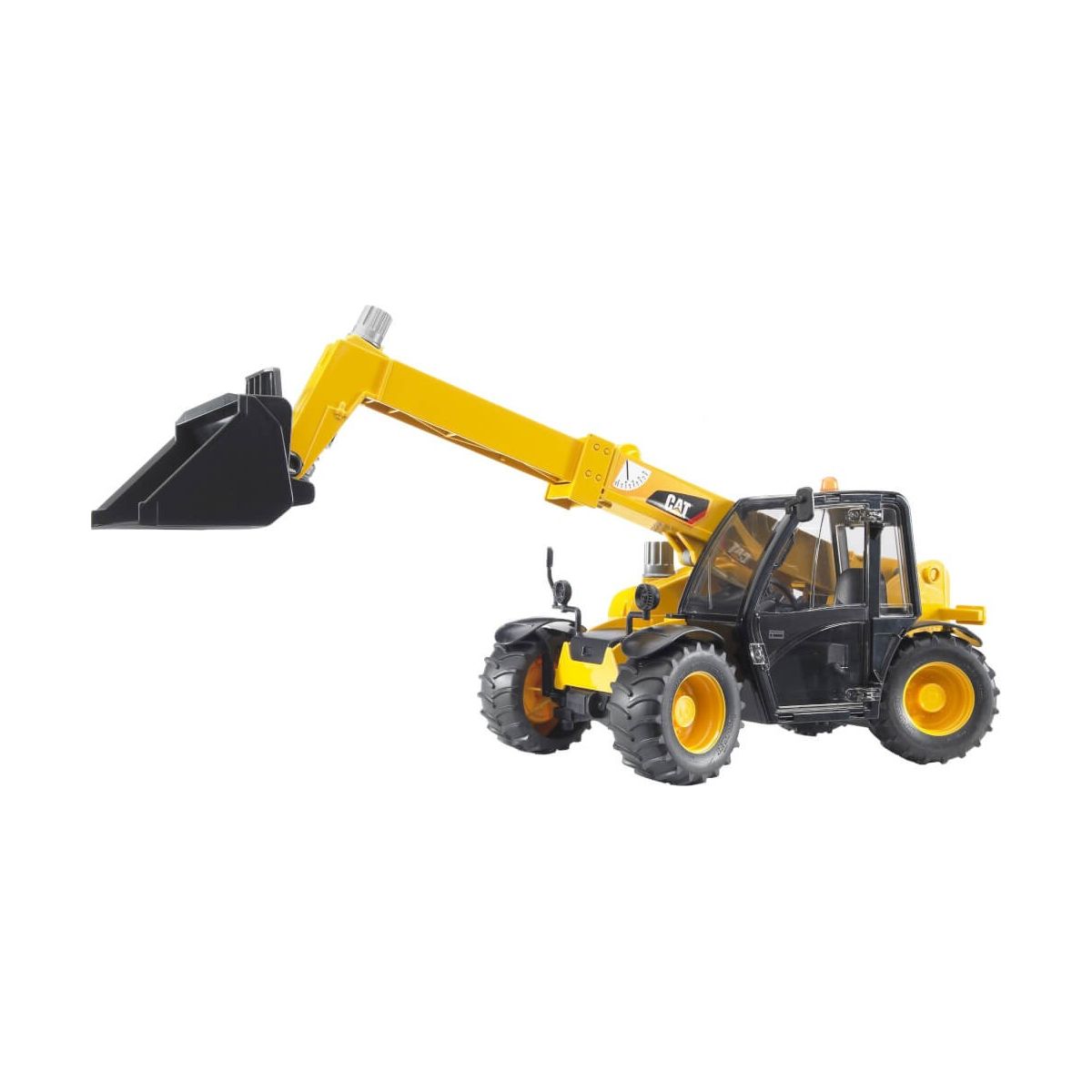 Der CATERPILLAR Teleskoplader ist ein wahres Multitalent. Ob es um das Schaufeln von großen Erdmassen, oder um das Verladen von empfindlichen Gütern auf Paletten geht, jederzeit ist der CAT Teleskoplader ein zu- verlässiger und effektiver Partner. Gerade seine geringen Abmessungen in Kombination mit dem weit ausfahr-baren Teleskoparm machen ihn oft zur ersten Wahl in den unterschiedlichsten Einsatzgebieten. Über vier sil- bern hervorgehobene Drehgriffe funktioniert die präzise Steuerung des CAT-Modells. Neben den Funktionen wie Verstellen der Armhöhe, Ausfahren des Arms und Winkelverstellung der Werkzeugaufnahme verfügt der Teleskoplader über eine gut arbeitende Vierradlenkung. Diese Lenkung des CAT Teleskopladers macht das Handling des Fahrzeuges, sowohl beim Original, als auch bei dem Modell von BRUDER, zu einem Kinderspiel..