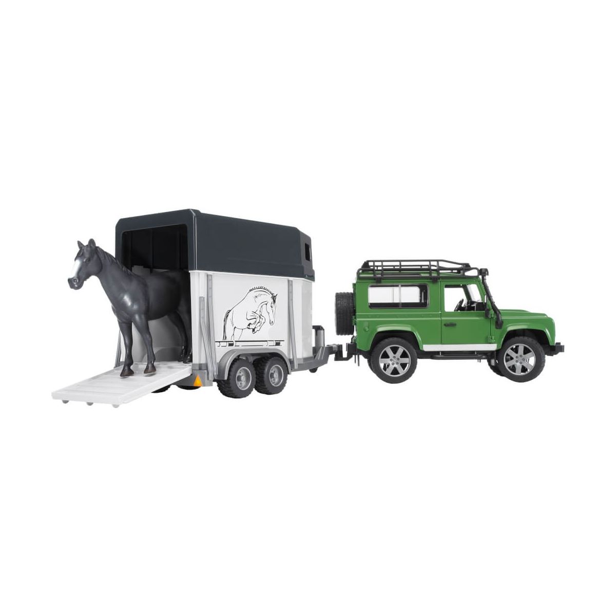 Faszinierende Offroad-Qualitäten kombiniert mit zeitlosem Land Rover-Design bietet der neue Defender von BRUDER. Wie alle Fahrzeuge wurde auch dieses Modell detailgetreu dem Original nachempfunden. Nicht nur die Fans der Marke Land Rover wird das entstandene Modell durch überraschende Details, wie z.B. das erhabene Strukturblech auf der Motorhaube und die zahlreichen bespielbaren Funktionen, überzeugen. Neben der Motorhaube, die einen Blick auf den detaillierten Motorblock ermöglicht, können auch die Heck- und die Seitentüren geöffnet und die Rücksitzbank herausgenommen bzw. die Anhängekupplung abgenommen werden. Durch die Federung beider Achsen wird auch beim Spielen jedes Terrain mit Leichtigkeit gemeistert. Zudem ist die Vorderachse durch die von BRUDER-Traktoren bekannte Zusatzlenksäule (im Lieferumfang enthalten) lenkbar und erlaubt so eine spielerische Kontrolle über das Fahrzeug. Die Kombination aus offroad-Tauglichkeit, schickem Design und dem anhängenden Pferdeanhänger macht dieses Fahrzeug besonders attraktiv für alle Reitsport-Fans.