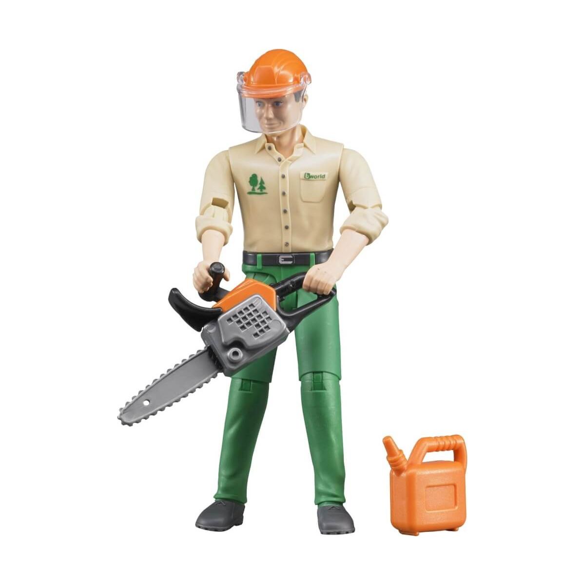 ''Das umfangreiche Sortiment von BRUDER beinhaltet zahlreiche Traktoren, Anhänger und Forstwirtschaftsgeräte. Die ideale Ergänzung hierzu sind die Spielfiguren, die der gesamten Spiellandschaft nochmals mehr Spielspaß und Realitätsnähe verleihen. Der Forstarbeiter mit Zubehör ist die ideale Ergänzung zu sämtlichen Forstwirtschaftsgeräten aus dem Sortiment. „Sicherheitshalber ausgestattet mit einem Schutzhelm mit Visier kann die Arbeit direkt beginnen. Zusätzlich sind eine Kettensäge und ein Benzinkanister in dem Set enthalten, um möglichst realistisch den Alltag eines Forstarbeiters nachspielen zu können. Der Kopf des Arbeiters, sowie die Arme und Beine sind beweglich und die Kleidung zum Thema passend gestaltet.