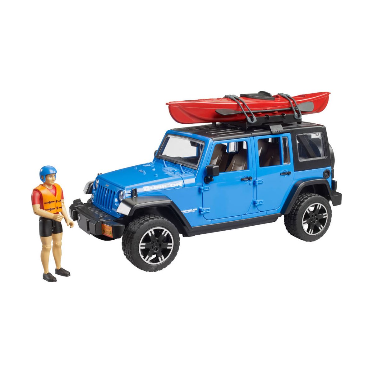 Kajaks sind heutzutage ein Sinnbild für den Sport- und Freizeitspaß auf dem Wasser. Dieses Sportgerät verbindet die Vorteile eines ganzheitlichen Fitnesstrainings mit besonderer Naturnähe. Erreicht man doch mit diesen Wassergefährten Uferstellen, die anderen Wassersportlern vorenthalten sind. Um an die schönsten Wassersport Gebiete zu gelangen, steht mit dem Jeep Wrangler Rubicon Unlimited ein echtes Offroad Talent zur Verfügung. Neben dem 2-teilig abnehmbaren Segmentdach, lassen sich auch die Motorhaube, die Hecktür und alle vier Türen öffnen. Selbstverständlich sind die Platzverhältnisse so, dass auch vier BRUDER bworld Figuren in das Fahrzeug passen. Alternativ zu der Vollbesetzung ist die Rücksitzbank herausnehmbar, um dann im Ladebereich über die BRUDER-Normverbinder Zubehör aufnehmen zu können. Die Zusatzlenksäule dient dem einfachen Lenken durch die Dachluke und kann bei Nichtverwendung im Fahrzeugboden verstaut werden. Die Achsen sind geländewagenüblich gefedert und die profilierten Räder besitzen verchromte Felgen in attraktiver SUV-Optik. Das Kajak wird auf dem mitgelieferten Dachträger transportiert..