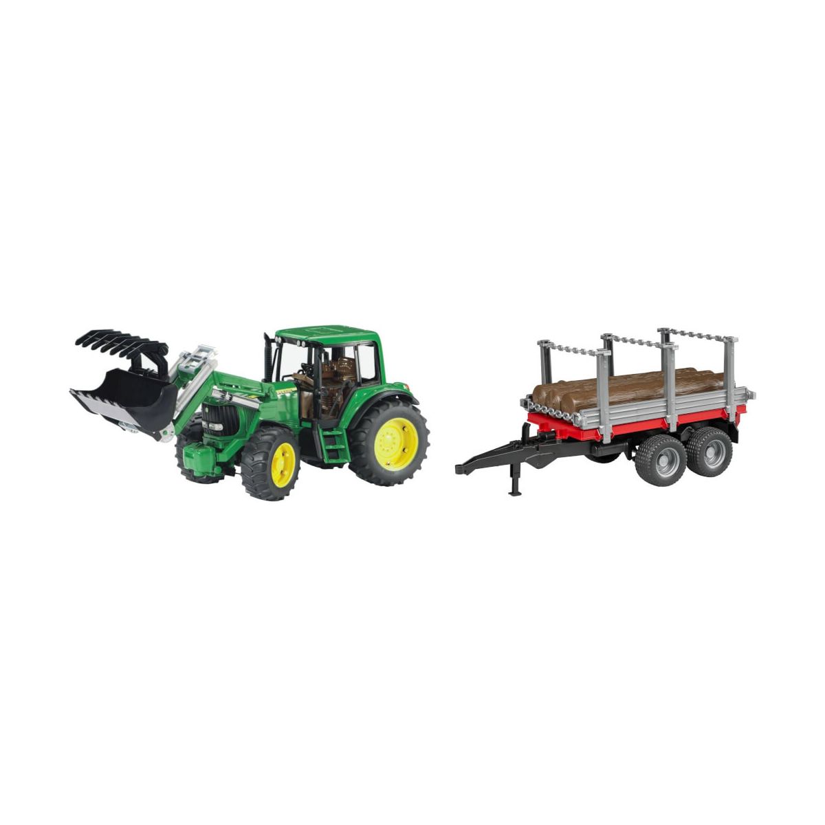 Sonderset bestehend aus John Deere 6920 Traktor mit Frontlader und Holztransportanhänger. Wie alle Traktoren der Profi-Serie ist auch dieser originalgetreue Traktor mit Zwillingsreifen ausrüstbar (nicht im Lieferumfang enthalten). Die Lenkung der geländegängigen Pendelvorderachse kann sowohl direkt über das Lenkrad im Fahrerhaus als auch über eine mitgelieferte Lenkstangenverlängerung erfolgen, welche die Kinder durch das Schiebedach im Fahrerhaus auf das Lenkrad stecken können. Der voll funktionsfähige Frontlader kann einfach durch das Entfernen des Frontgewichtes aufgesteckt und wieder abgenommen werden. Die Motorhaube kann geöffnet werden und gibt so den Blick auf den Motorblock frei. Profilreifen runden das Bild ab. Alle der zahlreich vorhandenen Anhänger und Anhängegeräte der Profi-Serie können mit dem John Deere 6920 Traktor kombiniert werden, um den kleinen Landwirten das Bestellen der Felder und damit die Produktion landwirtschaftlicher Erzeugnisse begreifbar zu machen.
