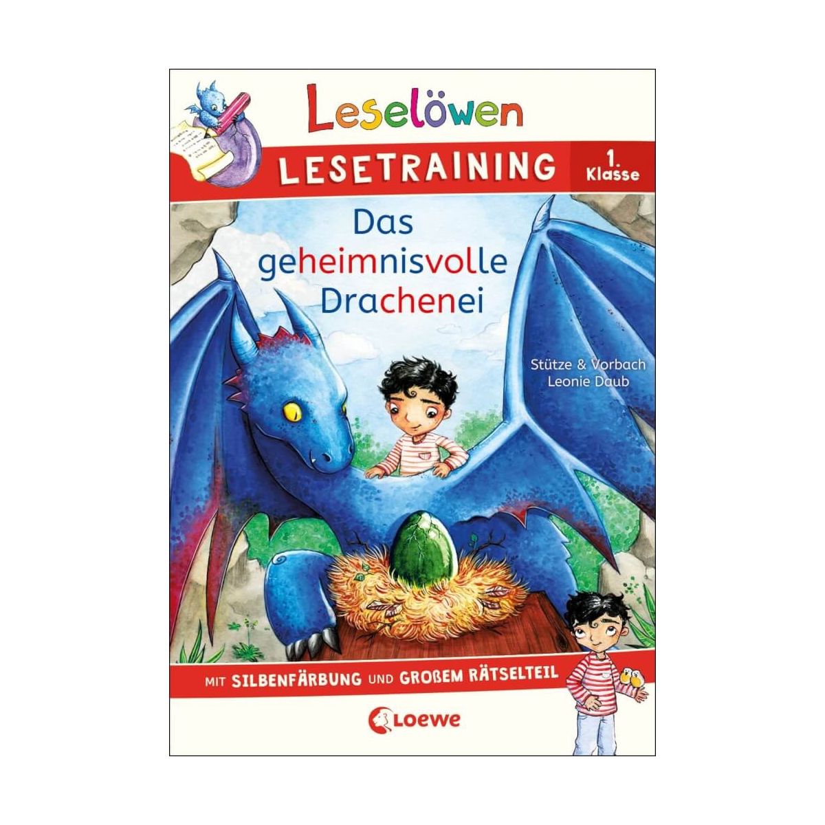 Lesenlernen leicht gemacht mit dem Leselöwen Lesetraining 1. Klasse. Ein Drachenei wurde gefunden! Der Drache Linus und sein Freund Max wollen das Ei unbedingt haben, denn nur sie wissen, wie man es ausbrütet. Aber auch eine Gruppe Forscher ist hinter dem Ei her. Ein Wettlauf beginnt …Mit Silbenfärbung und Leselernschrift. Mit vielen Rätseln, die den Wortschatz erweitern. Ideal zum Lesenlernen in der 1. Klasse. Lesenlernen ganz einfach – mit dem Leselöwen Lesetraining für die 1. Klasse! So wird jedes Kind ab 6 Jahren zu einem echten Leseprofi: Die spannenden Geschichten motivieren zum Lesen, farbig markierte Silben erleichtern es, den Sinn der Wörter zu erfassen, und die vielen tollen Rätsel am Ende des Buches sorgen für eine spielerische Erweiterung des Wortschatzes. Schenken Sie Ihrem Kind das bewährte Leselöwen-Erfolgskonzept zum Lesenlernen! Eine spannende Geschichte über Drachen Silbenfärbung in blau und rot. Große Schrift: auch für Kinder geeignet, denen das Lesen und Schreiben schwerfällt. Mit Kreuzworträtseln, Punkterätseln, Schwedenrätseln, Brückenspielen …Mit Lösungen zu allen Rätseln. Seit über 45 Jahren lernen Kinder mit den Leselöwen erfolgreich lesen. Über 29 Millionen verkaufte Exemplare – Die Nr. 1 in Deutschland, Österreich und der Schweiz Top Preis-Leistungs-Verhältnis!.