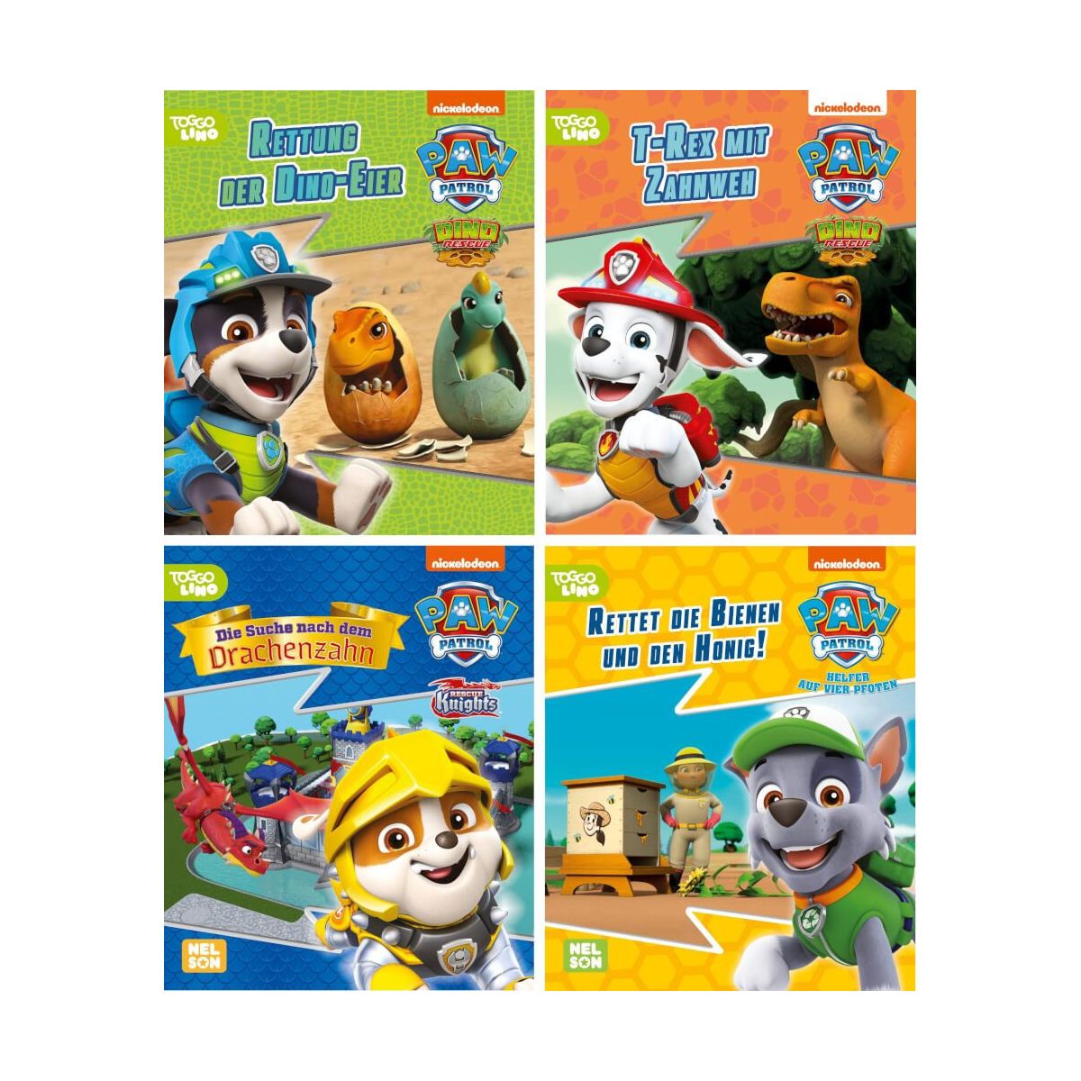 Die PAW Patrol nimmt kleine Fans mit in neue Welten!Spannende Einsätze der Welpen mit ganz neuen Aufgaben: Sie helfen ihren Freunden im Dinoland, nehmen es mit echten Drachen auf und retten die Bienen aus der Abenteuerbucht!PAW Patrol ist die erfolgreichste Vorschulmarke weltweit und begeistert immer wieder mit neuen Inhalten und Themen.Die besten neuen Geschichten basierend auf den Folgen der TV-Serie und den neuen Schwerpunkten Dino Rescue und Rescue Knights gibt es jetzt im Nelson-Minibuch!Vier Minibücher mit heldenhaften Einsätzen, auch praktisch für unterwegs: • PAW Patrol – Dino Rescue: Rettung der Dino-Eier • PAW Patrol – Dino Rescue: T-Rex mit Zahnweh • PAW Patrol – Rescue Knights: Die Suche nach dem Drachenzahn • PAW Patrol: Rettet die Bienen und den Honig!Eine Bestellung unter dieser ISBN beinhaltet eines der abgebildeten Minibücher. Das Set mit allen 4 Minibüchern ist unter der ISBN 978-3-8451-2278-6 erhältlich..