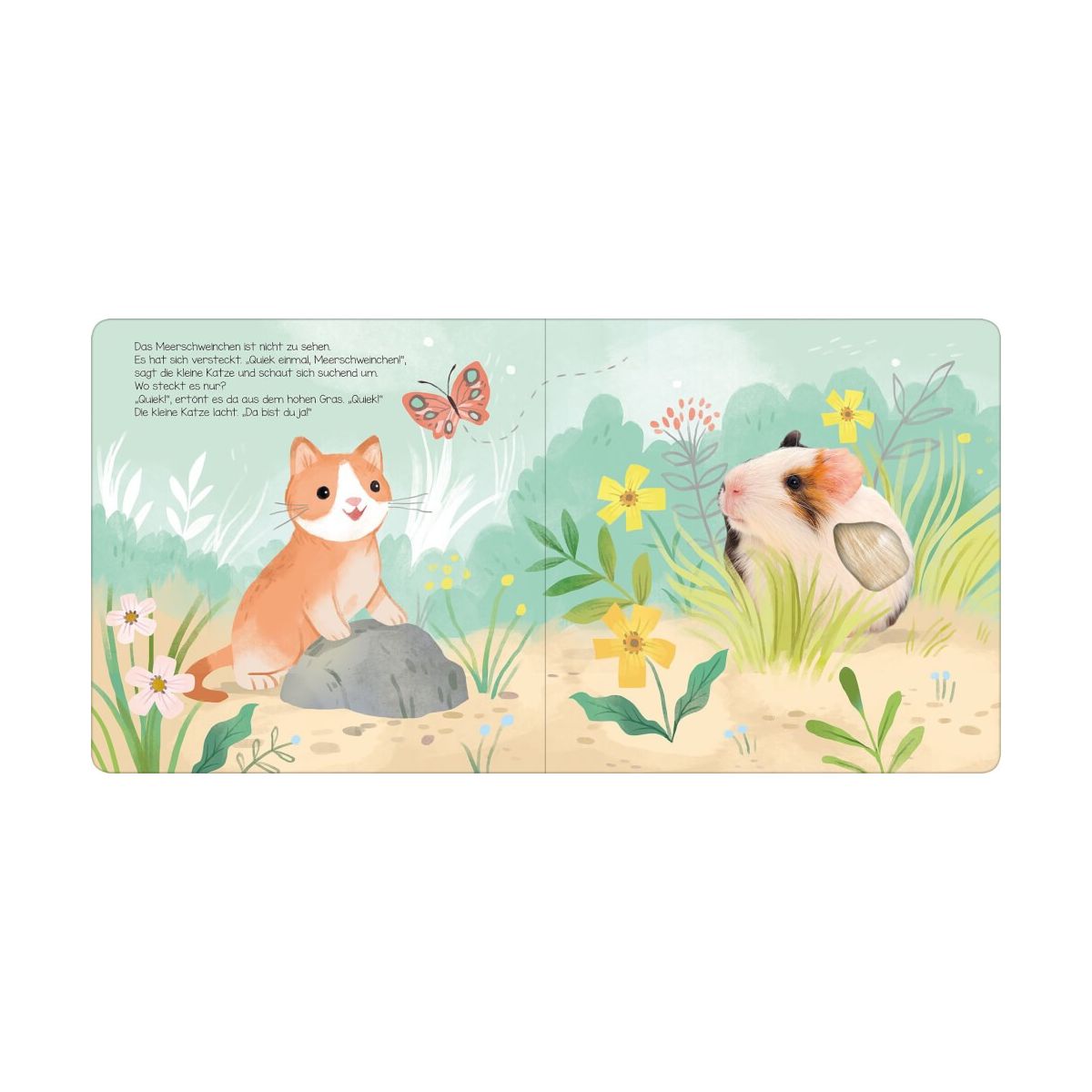 Meine erste Tiergeschichte mit Sound. Miau, macht die kleine Katze. Sie möchte mit ihren Freunden spielen! Spielst du mit? Was machen der Hund, das Meerschweinchen und der Vogel für Geräusche? Und wie klingt Mama Katze? Streichle über ihr Fell und finde es heraus. Das Fühlbuch mit vielen hochwertigen Fotos, Illustrationen und Soundmodulen begeistert schon die Kleinsten und macht das gemeinsame Vorlesen zum interaktiven Erlebnis für alle Sinne. Fühlen, hören und staunen. Begleite die kleine Katze durch ihren Tag und treffe alle ihre tierischen Freunde. Auf jeder Doppelseite ist ein anderes Haustier abgebildet und möchte gestreichelt werden. Die Kombination aus Tiergeschichte und Fühl- und Soundelementen bietet ersten altersgerechten Vorlesespaß. Kuschelweiches Fell, atmosphärische Tiergeräusche und realistische Tierfotos sorgen für spielerische Entdeckerfreude und fördern die Hand-Auge-Koordination und die Lautbildung. Das Vorlesefühlbuch mit Sound eignet sich für Kinder ab 18 Monaten. Für alle Fans von Hör mal rein, wer kann das sein? : Die neue Streichel-Sound-Reihe überzeugt mit wunderschönen Illustrationen und einer ersten Geschichte. Kombination aus realistischen Fotos und Illustration: Die hochwertigen Tierfotos sorgen für ein schnelles Erkennen der Tiere. Mit Soundmodulen: Die Tiergeräusche lassen sich kinderleicht beim Streicheln des Fells auslösen. Alle Sinne kommen zum Einsatz: Das Babybuch fördert die Motorik, die Lautbildung und animiert zum Spracherwerb. Für empfindliche Kleinkindohren: Sound wird in angenehmer Lautstärke wiedergegeben. Ton abschaltbar: Dank des praktischen An- und Ausschalters auf der Buchrückseite lassen sich die Geräusche ein- und ausschalten. Batterien auswechselbar: Die Bücher enthalten handelsübliche Knopfzellenbatterien vom Typ LR 1130 mit je 1,5 V, die sich problemlos auswechseln lassen. Geprüfte Qualität: Das Buch unterliegt strengen Sicherheitsanforderungen und regelmäßigen Qualitätskontrollen nach europäischer Spielzeugsicherheitsrichtlinie..