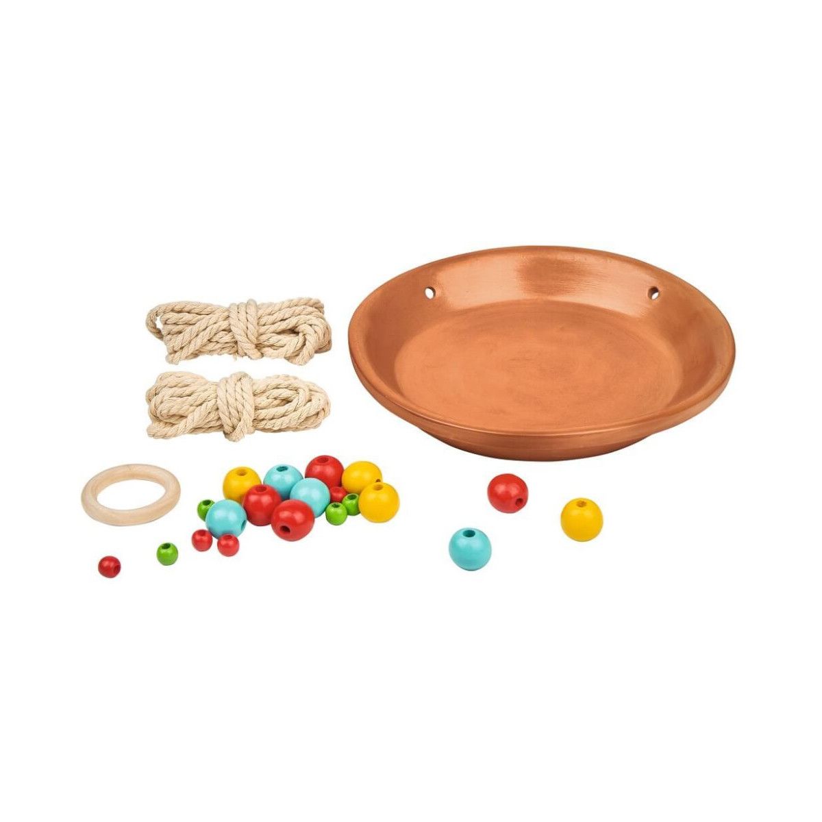 Was gibt es Schöneres, als Vögel beim Trinken und Baden direkt vor dem eigenen Fenster zu betrachten? Die Krabbelkäfer Vogeltränke zum Selbstgestalten lässt kleine Tierfans und Naturliebhaber*innen ein eigenes kleines Vogelbad bauen. Das macht nicht nur Spaß, sondern tut auch den Wildvögeln gut: Die Wasserstelle hilft sowohl bei kalten Temperaturen, wenn andere Wasserquellen möglicherweise zugefroren sind, als auch bei Hitze, die für ausgetrocknete Pfützen und Gräben sorgen kann. Zum Zusammenbauen einfach die Baumwollschnüre nach Belieben mit den bunten Holzperlen schmücken und an die Keramikschale anbringen. Schon kann der Wasserbehälter für Rotkehlchen, Spatz und Co. auf dem Balkon, im Garten oder auf der Terrasse aufgehängt werden. Mit etwas Glück lassen sich schon bald Vögelchen beim Genuss des frischen Wassers beobachten und kleine Forscher*innen können sehen, wie sich die Vögel verhalten. So erfreuen sich nicht nur die gefiederten Freunde, sondern auch kleine Kinder an der farbenfrohen Vogeltränke. + Vogeltränke zum Selbstgestalten + Inhalt: 1 Keramikuntersetzer mit 4 vorgebohrten Aufhängelöchern, 1 Holzring, 2 Baumwollschnüre, 20 Holzperlen in vier Farben, 1 Anleitung.