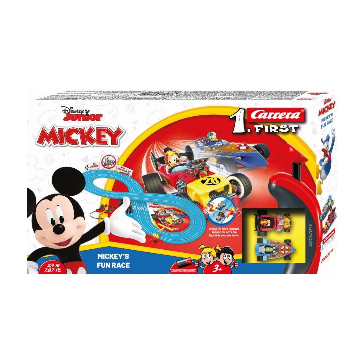 Mickey - Fun Race Carrera FIRSTSpaß ohne Ende mit Mickey und DonaldAb 3 JahrenLustiger Spi elspaß mit Mickey Mouse und Donald DuckDie beiden Freunde Mickey und Donald kommen in dein Kinderz immer! Mit dem Carrera FIRST ?Mickey - Fun Race? Set flitzen die beiden Kids-Allstars über deine 2,4 Meter lange, blaue Spielbahn. Die besonders bunte Bahn und die detailgetreuen Spielzeugautos überze ugen dank Originallizenz auf jeden Fall! Die Bahn fällt mit den Mickey Maus-Deko-Elementen, wie dem lustigen Kreisel im Kinderzimmer auf. Das Carrera FIRST-Set ist dank batteriebetrieb und dem ein fachen Stecksystem bestens für unterwegs geeignet..