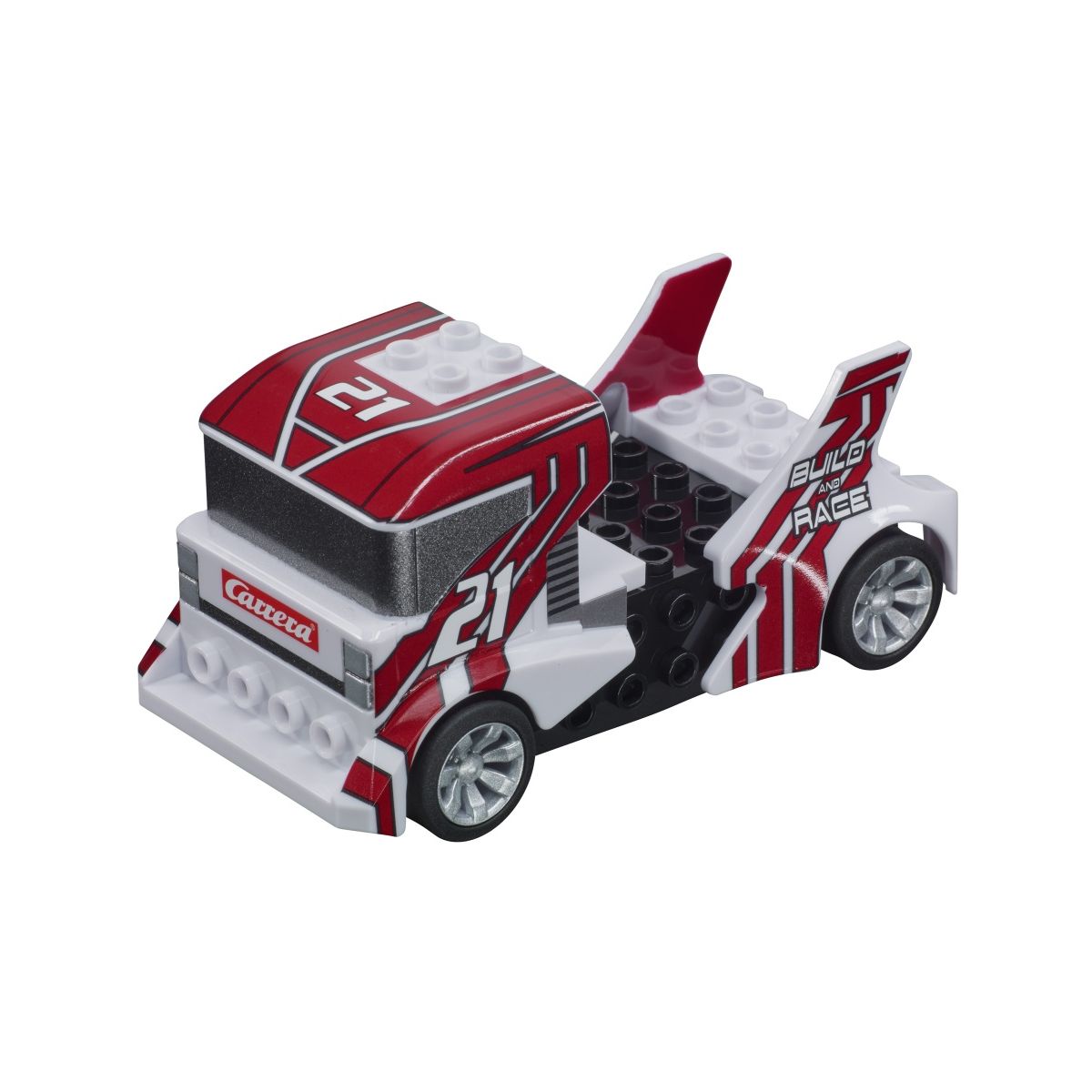 Build n Race Truck white Carrera GO!!! Das Beste aus zwei Spielwelten vereint Maßstab 1:43 Ab 6 Jahren Fahren ohne Grenzen Bei Carrera GO!!! Build n Race kannst du ab sofort dein Traumbol ide selbst kreieren. Der riesige weiße Truck mit der Startnummer 21 und coolen Streifen kann mit Bau steinen, die man bereits zuhause hat, nach Belieben gestalten, aber auch schnell wieder umbauen. Zei ge deinen Freunden was du drauf hast und rausche an den bunten Strecken, Brücken, Überfahrten und we iteren Hindernissen mit Vollspeed vorbei. Neue Welten selbst erschaffen Nach dem Zusammenbauen des Fahrzeuges kannst du mit dem coolen Build´n Race Truck white im Maßstab 1:43 über die Carrera G O!!! Rennstrecke sausen und jedem zeigen, dass du alle Herausforderungen locker meisterst!.