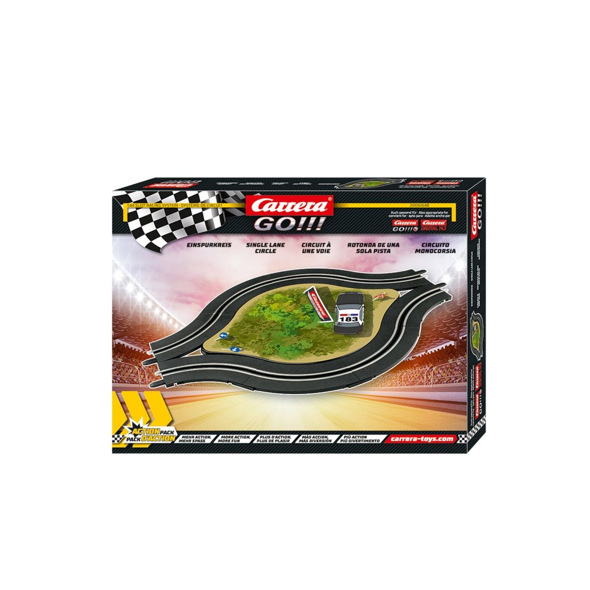 Einspuriger Kreis mit dekorativem ElementDIGITAL 143, GO!!! Plus, GO!!!Packungsinhalt: 8 x Schie nenteile, 1 x Deko-Element, 12 x Schienenverbinder, 4 x Doppel-Schienenverbinder Dekoratives Streckenelement für Deine RennbahnRaffinierte Schikane und dekorativer Eyecatcher in einem: Der E inspurkreis mit richtiger Dekoration ergänzt Deine Carrera Bahn auf gekonnte Art und Weise. Das Deko element in der Mitte setzt den Einspurkreis perfekt in Szene. Zu sehen ist ein Autowrack auf dem Gru nd eines ausgetrockneten Gewässers. Natürlich kannst Du das Deko-Element auch ganz nach Deinen Vorst ellungen dekorieren. Wie wäre es beispielsweise mit Gebäuden oder ein paar selbstgebastelten Bäumen? Der Einspurkreis im Maßstab 1:43 ist eine tolle Erweiterung für die Carrera GO!!!, GO!!! Plus und D IGITAL 143 Bahnen. Wer kommt schneller durch den Kreis und kann das Rennen am Ende für sich entschei den? Die Packung beinhaltet acht Schienenteile, ein Deko-Element sowie vier Doppel-Schienenverbinder und 12 Schienenverbinder..