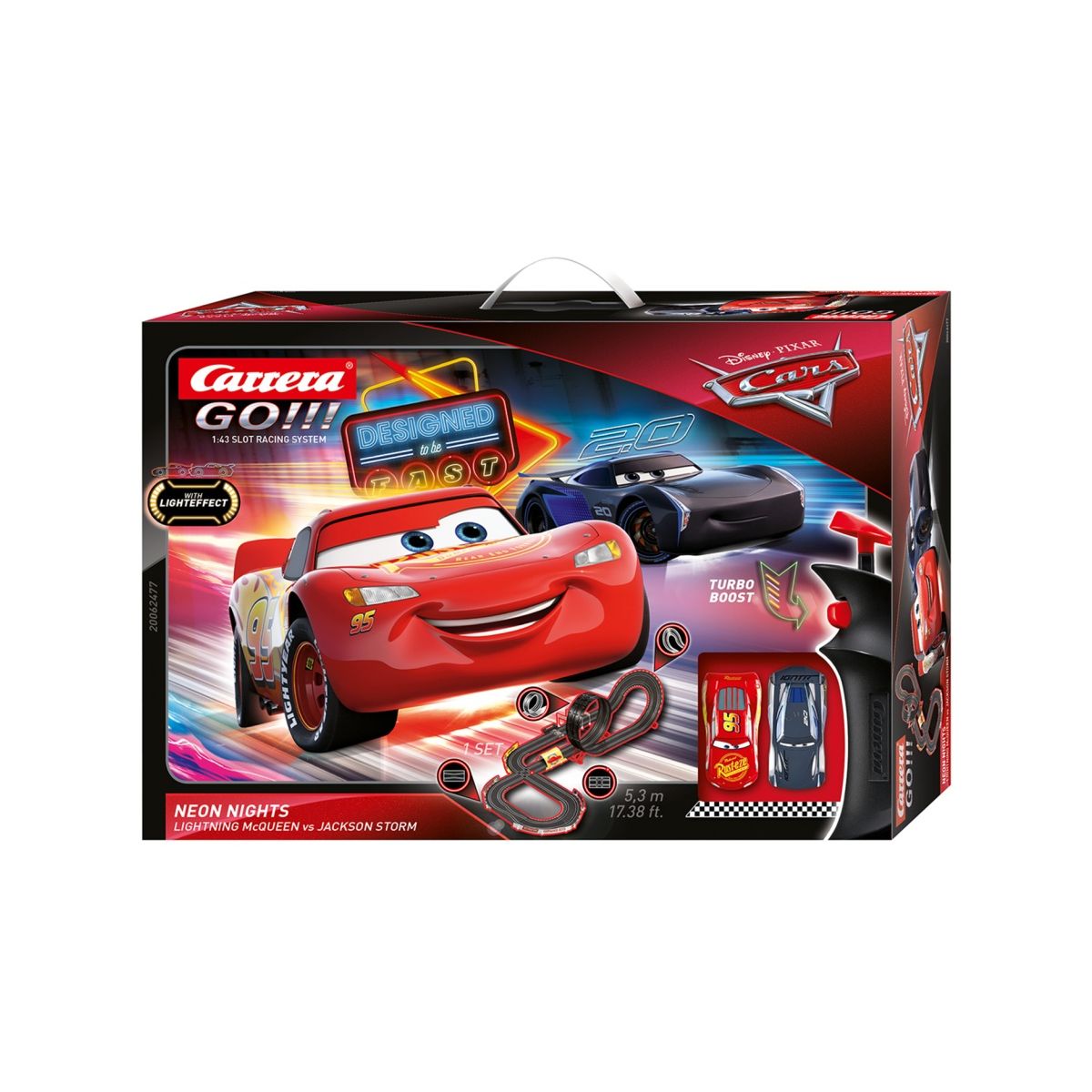 Spektakuläre Carrera GO!!! Rennstrecke ?Disney* Pixar Cars Neon Nights mit zwei Slotcars Carrera GO!!! Action-Zubehör und Deko-Elemente für tollen Rennspaß 5,3 Meter Ab 6 Jahren Nach Son nenuntergang geht es hier erst richtig los Die Dunkelheit hält die beiden Filmhelden Lightning McQu een und Jackson Storm nicht auf. Mit der Beleuchtung ihrer Scheinwerfer und der Lichtreklamen rechts und links neben der Fahrbahn suchen die beiden Rennautos sich ihren Weg und fechten ein erneutes Ma tch aus. Mit Adrenalin durch die Nacht Rasante Rennen kannst Du Dir auf dieser Carrera GO!!! Strecke sowohl am Tag als auch in der Nacht liefern. Bei Dunkelheit kommt die coole Unterbodenbeleu chtung der beiden Autos aber besser zur Geltung. Auf der 5,3 Meter langen Rennbahn im Maßstab 1:43 s chenken sich die beiden Gegner nicht einen Zentimeter. Die Strecke führt durch einen Looping, einen Fly-Over, eine Engstelle und über eine Kreuzung. Die Slotcars im Maßstab 1:43 sehen den Original-Fil mhelden sehr ähnlich. Das Set enthält neben den beiden Autos und der Rennstrecke auch zwei Handregle r mit Turbo-Button, einen Transformator, das Zubehör für die Bahn und Dekoelemente..