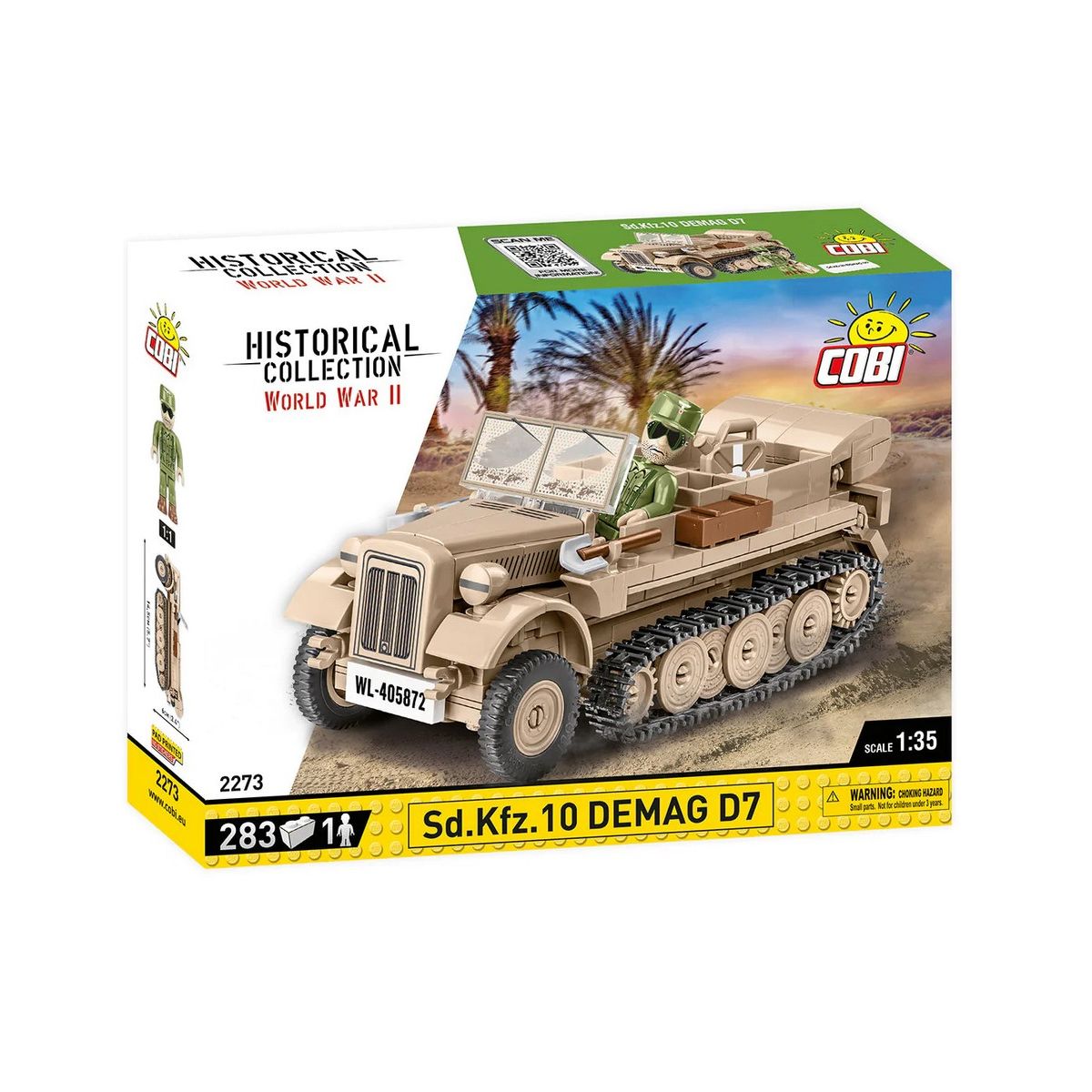 ''COBI-2273 Sd.Kfz.10 DEMAG D7 Historical Collection WORLD WAR II 280 bricks 1 figure Age group 8+ Scale 1:35 Sd.Kfz.10 DEMAG D7 was a light, half-track artillery tractor produced in 1937-1945 for the needs of the German army. The basic version could carry 2 crew members and 6 passengers (gun crew). It was the basic tractor used in motorized artillery. The popularity of the vehicle is evidenced by the production scale reaching 17,000 units. The COBI Sd.Kfz.10 artillery tractor was designed with attention to detail in a 1:35 scale model, using 290 elements. It contains moving parts and high-quality, durable prints. The set perfectly complements the growing collection of historical block vehicles in 1:35 scale. It will definitely find a place in your collection alongside Blitz trucks, Horch cars and other amazing vehicles released in the same series and scale by COBI. The set includes a figure of an Afrika Korps soldier. There are additional accessories on the vehicle, like a new type of box, a spade and a crowbar. The construction of the kit is simple. Intuitive instructions based on clear illustrations will help you easily go through the entire process of a satisfying construction experience. Build history, piece by piece and create your own collection! • 290 high-quality elements • Produced in the EU by a company with over 20 years of tradition • The blocks meet the safety standards of products for children • Fully compatible with other brands of construction blocks • Blocks with prints do not scratch or smear and do not fade during play or under the influence of temperature • Clear and intuitive instructions based on illustrations and step-by-step directions • 1 minifigure, DAK soldier • DEMAG D7 half-track vehicle model • 1:35 scale • Nameplate Model dimensions (length x width x height) Vehicle: 145 mm x 65 mm x 60 mm ''.