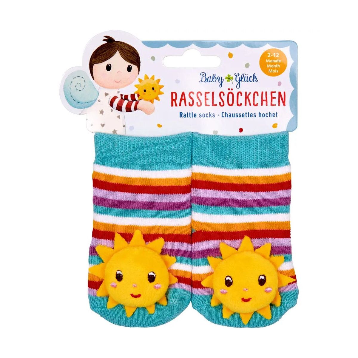 Liebevoll. Das besondere Etwas. Trendiges Design. Hochwertige Materialien. Spielsachen, die Kindern Spaß machen. Geschenkideen zu jedem Anlass… all das ist BabyGlück.Diese fröhlich bunten Rassel-Söckchen mit fröhlichem Sonnen-Motiv sind mit kuschelweichem Frottee gefüttert, halten kleine Füße warm und wecken durch das sanfte Rasseln Babys Neugier. Sie laden zum Erkunden und (Be-)Greifen ein und unterstützen spielerisch die motorische Entwicklung Ihres Kindes. Die besondere Gestaltung mit Applikation und liebevoller Stickerei verzaubert Groß und Klein. Besonders praktisch: Die Socken sind waschbar bei 30 Grad und somit schnell wieder hygienisch sauber.Egal ob zur Geburt, zur Taufe oder zum ersten Geburtstag: für (werdende) Eltern, Großeltern und Freunde, die auf der Suche nach einer langlebigen Geschenkidee sind, ist BabyGlück die perfekte Wahl..