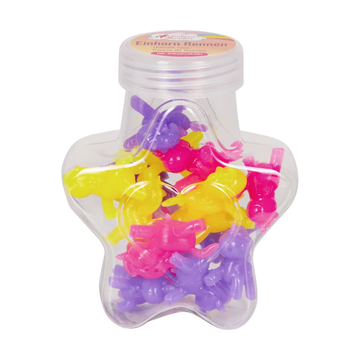 Willkommen im Einhorn-Paradies! Das Einhorn-Rennen, hergestellt von Die Spiegelburg, ist ein Set aus 18 Einhörnern in 3 verschiedenen Farben. Fordere deine Freunde zum Einhorn-Duell! Die Spielidee ist einfach, aber spannend: Jeder Mitspieler lässt Einhörner einer bestimmten Farbe eine glatte Oberfläche herunterkrabbeln. Der Mitspieler, dessen Einhorn als Erstes den Boden erreicht, gewinnt das Wettrennen! Ein zauberhafter Zeitvertreib für echte Einhorn-Fans!.