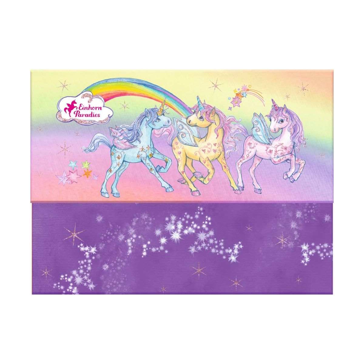 Wer schreibt, der bleibt! Mit diesem Briefpapier von Die Spiegelburg bleiben echte Einhorn-Fans in Kontakt. Das glitzernde Set umfasst 21 Briefbögen und 12 Umschläge, liebevoll gestaltet in drei verschiedenen Motiven aus dem Einhorn-Paradies. Ergänzt wird das Set durch fünf charmante Postkarten und einen Stickerbogen, um Briefe und Karten individuell zu verzieren und zu personalisieren. Perfekt organisiert in einer praktischen Mappe mit Register und Klettverschluss: Ob für Einladungen zu Kindergeburtstagen, Dankeskarten oder einfach nur zum Austausch von geheimen Nachrichten mit Freunden – dieses Briefpapier-Set ist das ideale Geschenk für kleine und große Einhorn-Fans..