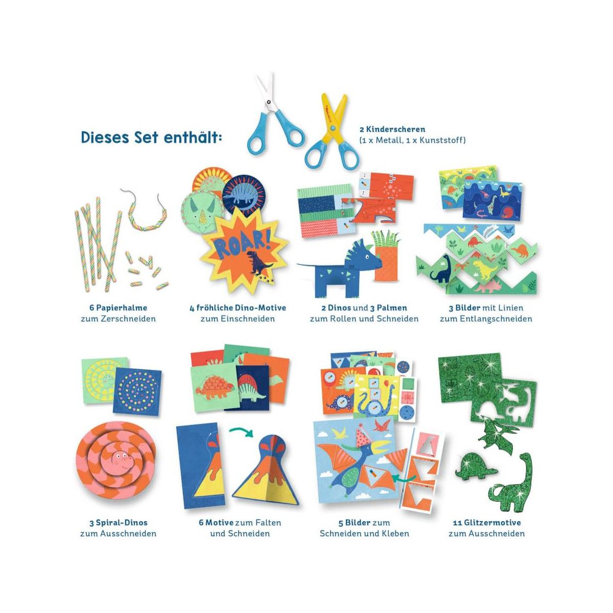 Schneiden lernen Schritt für Schritt vom einfachen Einschneiden bis zum Ausschneiden anspruchsvoller Formen mit 30 dinosauerierstarken Schneide-Projekten. Diese Bastelbox für Kindergartenkinder enhält: 2 Kinderscheren (1x Metall, 1x Kunststoff), 6 Papierhalme zum Zerschneiden, 4 fröhliche Dino-Motive zum Einschneiden, 2 Dinos und 3 Palmen zum Aufrollen und Einschneiden, 3 Bilder mit Linien zum Entlangschneiden, 3 Spiral-Dinos zum Ausschneiden, 6 Motive zum Falten und Schneiden, 5 Bilder zum Schneiden und Kleben, 11 Glitzermotive zum Ausschneiden. DAS Set zum Schneidenlernen mit tollen Ergebnissen zum Spielen, Dekorieren, Aufbewahren und Verschenken!.