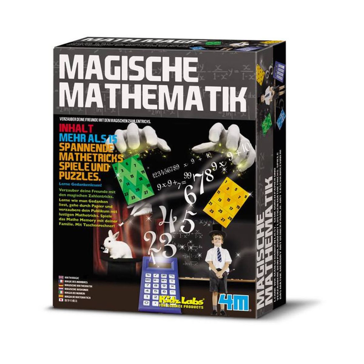 ''Verzaubert Freunde und Familie mit den magischen Mathe-Tricks. Mehr als 15 spannende Mathe Tricks, Spiele & Puzzles sind im Set enthalten. Lernt, wie man Gedanken liest, überrascht Freunde mit superschnellen Speed -Rechnungen, spielt das speziell entwickelte Math Memory mit der Familie und vieles mehr! Enthält einen Taschenrechner. | | Inhalt: Taschenrechner, 2 Würfel, 1 Setz magische Karten zum Gedankenlsen, magisches Quadrat, super-magisches Quadrat, 1 Set Schöne Mathematik''''-Karten, 40 Mathe Memory Karten, Flexagon Puzzlevorlagen, Klappkarten Puzzlevorlagen, Anleitung | | Größe Produkt (cm): 5,8 x 21,5 x 16,7 | | Größe Verpackung (cm): 22 x 17 x 6''''''