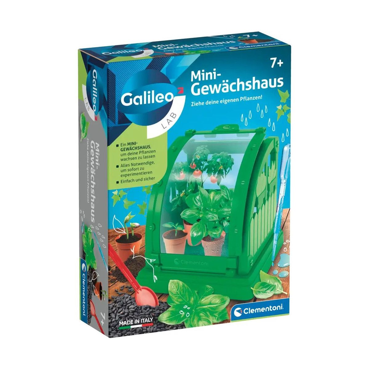 Ziehe mit diesem Mitbring-Experiment deine eigenen Pflanzen! Das Galieo Lab Set besteht aus einem Mini-Gewächshaus zum Zusammenbauen, kleinen Töpfen, Torf, schnellwachsenden Samen und Zubehör. Es ist ein einfaches Botanik-Set, mit allem, was du brauchst, um sofort loslegen zu können. Das Mini-Gewächshaus hat eine Klappe auf der Vorderseite, um die Pflanzen leicht zu pflegen. Es ist aus widerstandsfähigen und hochwertigen Materialien, um die Welt der Botanik auf einfache und sichere Weise zu entdecken..