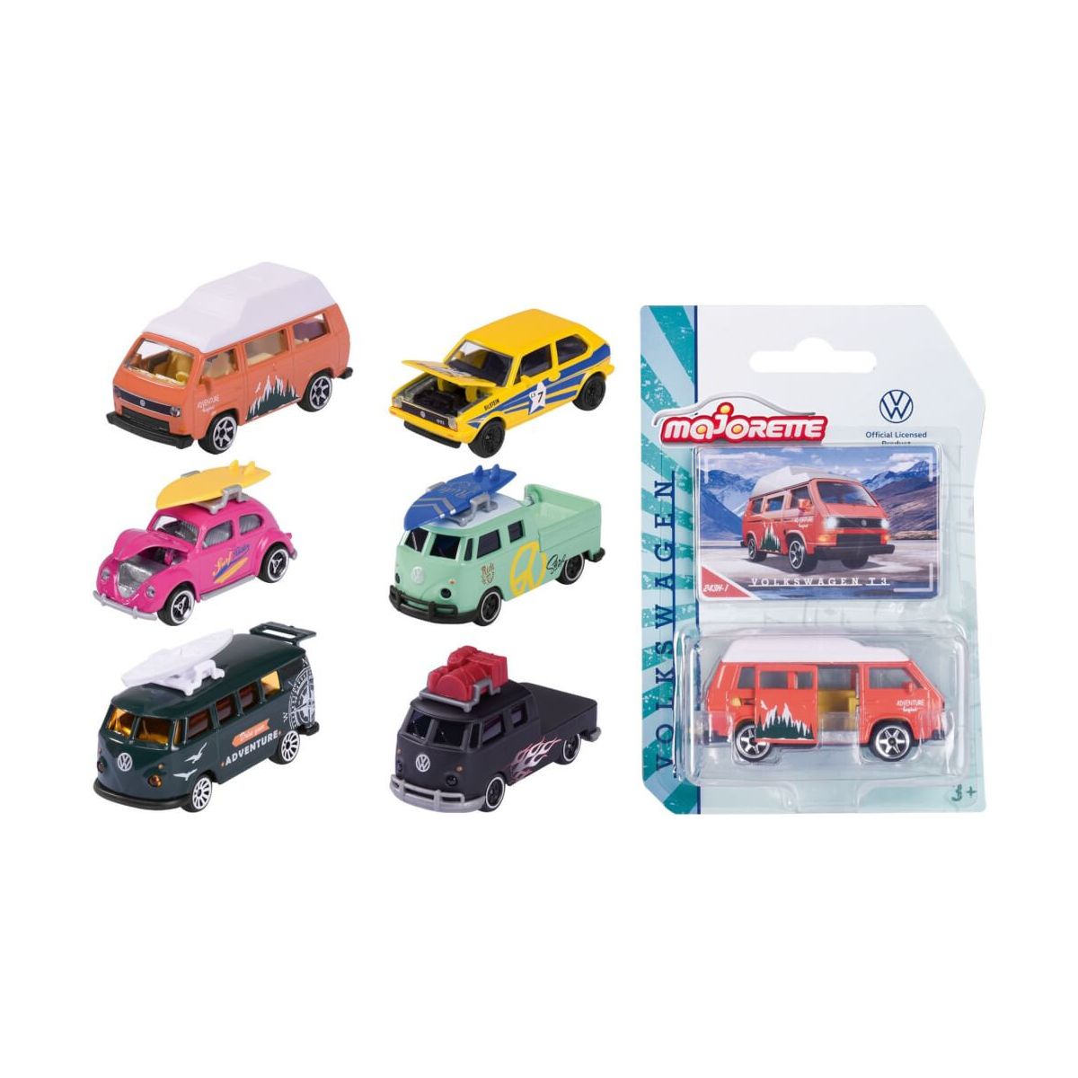 Majorette - Volkswagen The Originals Premium Cars - 1 von 6 zufälligen VW-Modellautos, Maßstab 1:64, mit offizieller VW Lizenz, hochdetaillierte Spielzeugautos • 1 Auto per Zufallsauswahl - ACHTUNG: Du erhältst EINES von 6 unterschiedlichen Fahrzeug-Modellen, die Auswahl erfolgt per Zufallslos. Jedes der 6 Modelle ist offiziell lizensiert von Volkswagen. • VW The Originals - Die beliebte Modellauto-Serie „VW The Originals Premium enthält VW Klassiker wie den Volkswagen Käfer, den Volkswagen Golf MK1, den Volkswagen T1 und den Volkswagen T3. • Individuell ausgestattet - Die Spielzeug-Autos (je ca. 7,5 cm) verfügen über eine Metall-Karosserie, Freilauf, Federung sowie ein ausgefallenes Design mit besonderen Details z.T. beweglichen Teilen. • Plus Sammelkarte - Passend zu deinem Automodell erhältst du eine Collectors Card - ideal als Geschenk für Modellauto-Sammler und Fans der berühmten VW Bullis Co. Geeignet für Kinder ab 3 Jahren. • Lieferumfang - Volkswagen Käfer, Volkswagen Golf MK1, Volkswagen T1, Volkswagen T1, Volkswagen T1, Volkswagen T3 Perfekt für VW-Liebhaber: Ein zufälliges Auto mit Sammelkarte von Majorette Die offiziell lizenzierten Spielzeugautos von Majorette sind das perfekte Geschenk für kleine und große Auto- sowie Sammelfans. Das 6-fach sortierte Sortiment enthält mit viel Liebe zum Detail gestaltete VW-Modelle. Doch nicht nur für das Auge wird viel getan. Für den Spielspaß sorgen Freilauf und die beweglichen Teile. Das Sortiment enthält beliebte Modelle wie Volkswagen Käfer, Volkswagen T1, T3 und Volkswagen MK1 – alle farbenfroh gestaltet. Teile, die sich kinderleicht öffnen und schließen lassen, sorgen für weitere Spielmöglichkeiten und regen so die Fantasie Ihrer Kinder an. Sie erhalten ein zufälliges Fahrzeug aus dem Sortiment und dazu eine Sammelkarte – eine schöne Überraschung! Majorette setzt auf realistische Fahrzeuge mit originalen Lizenzierungen aus der Automobilindustrie sowie auf qualitativ hochwertige Ausführungen aus Metall, damit Sie und Ihre Kinder lange etwas davon haben. • 1 Spielzeugauto mit Sammelkarte • Maßstab: 1:64 • Länge: 7,5 cm • Material: Metall/Kunststoff • Altersempfehlung: 3+ Jahre Über Majorette - Die Kultmarke aus Frankreich verzaubert seit 1964 Autofans auf der ganzen Welt Die realitätsgetreuen und original lizensierten Modelle weltweit bekannter Automarken sind besonders hochwertig und widerstandsfähig. Von PKWs, Monstertrucks, Einsatz- und Baufahrzeugen bis hin zu Rennautos. Majorette bietet eine riesige Auswahl an Spielzeugautos aus Metall sowie dazu passende Parkhaus-Spielsets zu verschiedenen Themenbereichen. Die kleinen Spielzeugautos aus Metall sind ideal für Kinder ab 3 bzw. 5 Jahren und ambitionierte Sammler jeden Alters..