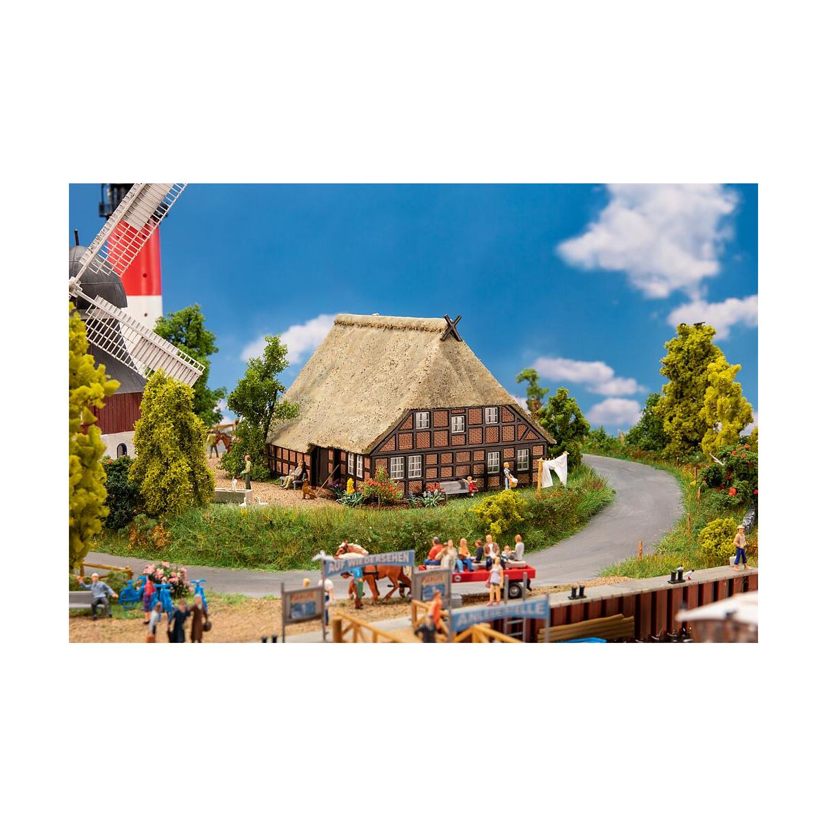 Historisches Modell eines niederdeutschen Hallenhauses, seit dem 13. Jahrhundert Sinnbild bäuerlichen Lebens in der Region Norddeutschland. Der Fachwerkbau mit roten Mauerziegeln und großem Einfahrtstor vereint Wohn-, Stall- und Scheunenbereich unter einem reetgedeckten Dach mit typischem Giebelschmuck..