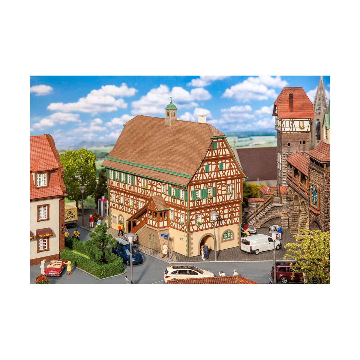 Das inspirierende Vorbild dieses Fachwerkhauses ist das Rathaus von Steinheim an der Murr im Kreis Ludwigsburg, Baden-Württemberg. Es präsentiert sich mit drei Etagen, einem markanten geteilten Schopfwalmdach und einer einladenden Durchgangspassage im Erdgeschoss, begleitet von seitlichen, überdachten Treppenaufgängen..