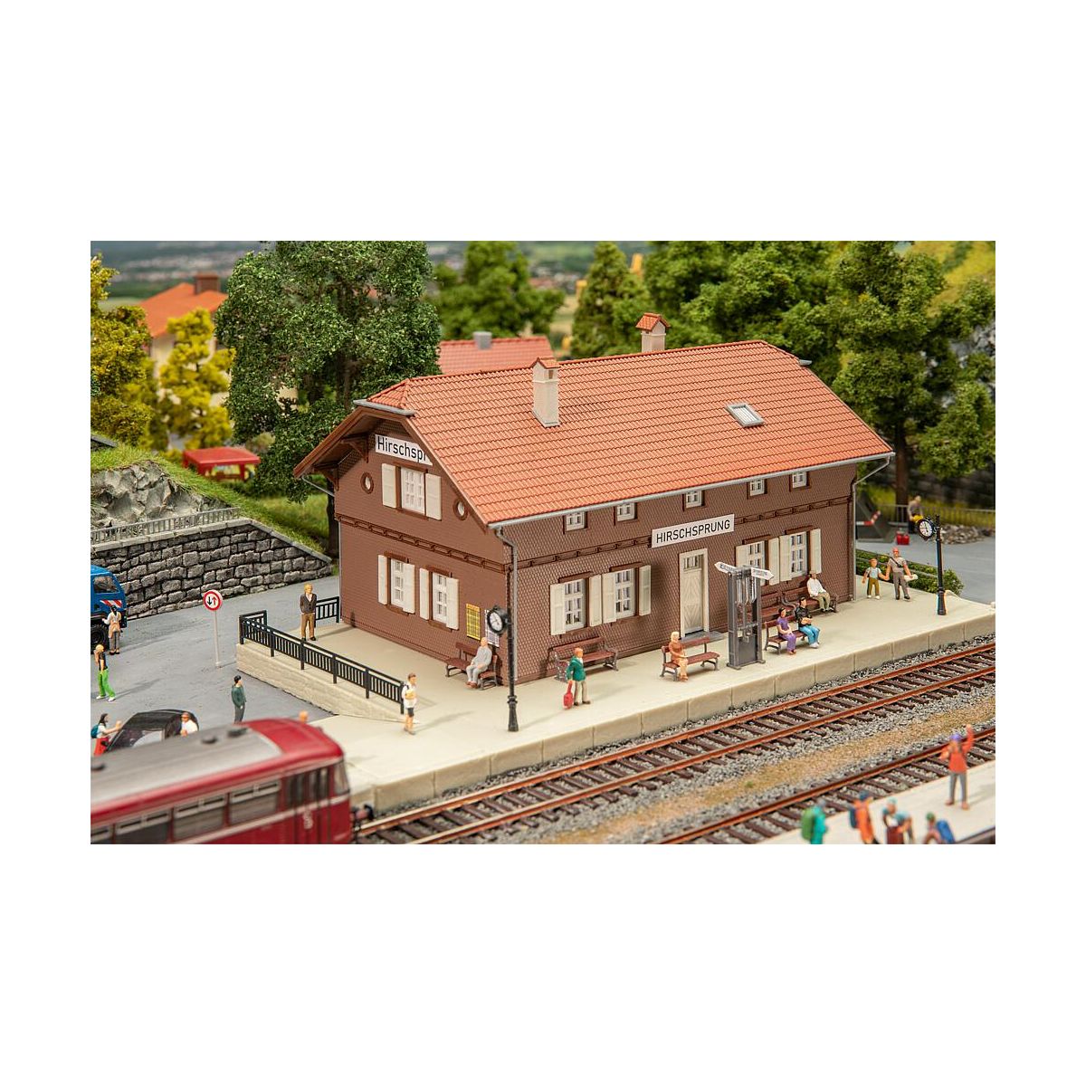 Typischer Bahnhof in Backsteinoptik, der sich an das bekannte Original an der berühmten Höllentalbahn im Schwarzwald anlehnt. Wartebänke und runde Zeigeruhren, Treppenaufgänge und Geländer sind liebevolle Details..