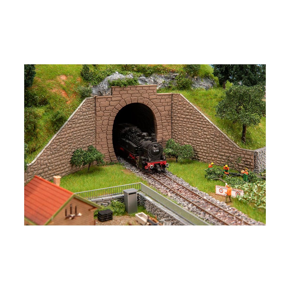 Die beiden Tunnelportale, in Bruchsteinoptik, sind für den Einsatz im eingleisigen Schienenverkehr und für den Oberleitungsbetrieb geeignet..