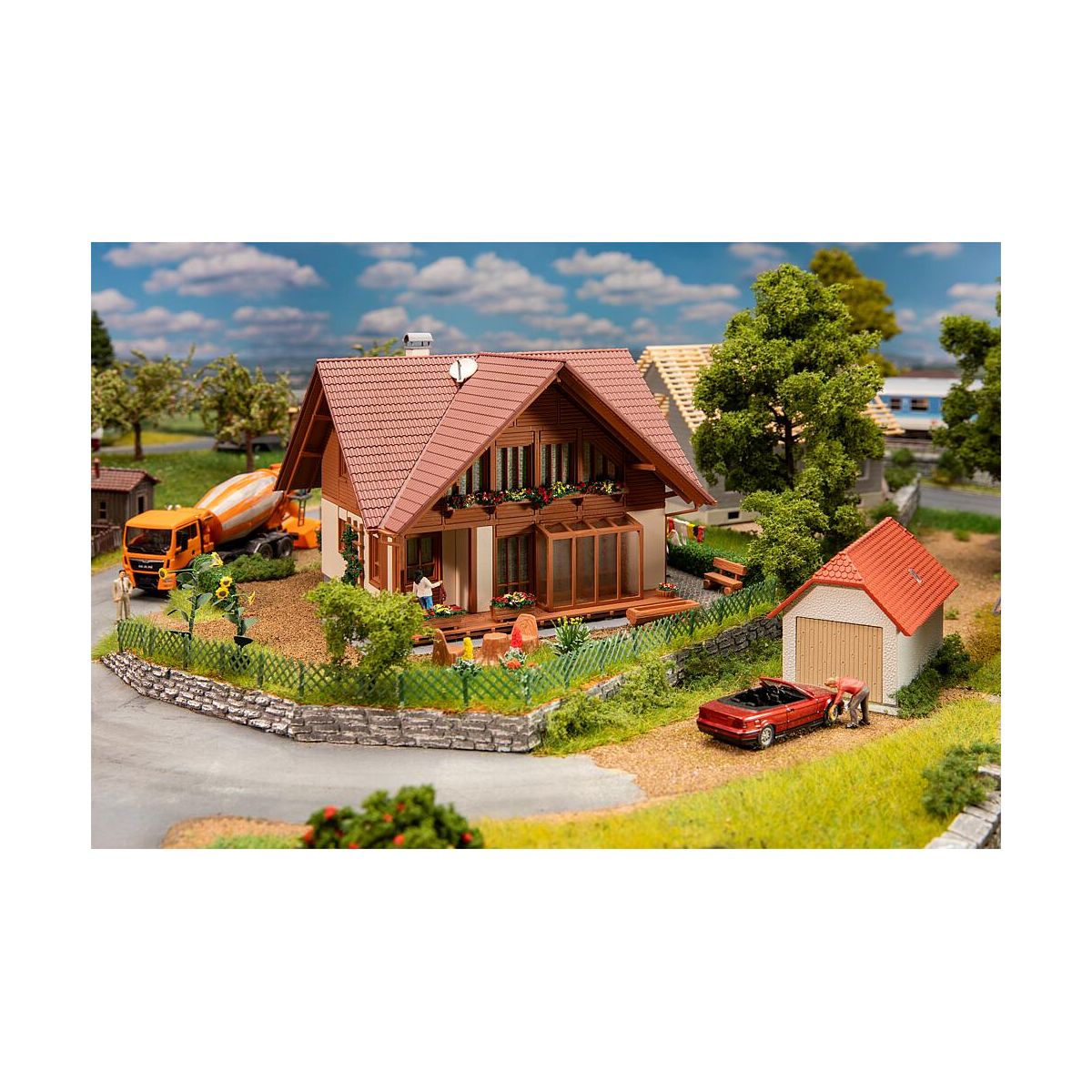 Nach einem Originalvorbild der Fa. Breisgau Haus aus den späten 80er Jahren entstand dieses architektonische Meisterwerk. Ganz im Stil jener Zeit typischen Wintergarten mit Glasfront und Holzrahmen, einem überdachten Balkon mit einem großen spitz zulaufenden Giebel, einer Holzveranda samt Blumenkübel und Rankgitter. Dem rustikalen Charme der 80er entsprechend gibt es einen ausgehöhlten Baumstamm als Wassertrog sowie mehrere Baumstümpfe für den Garten..