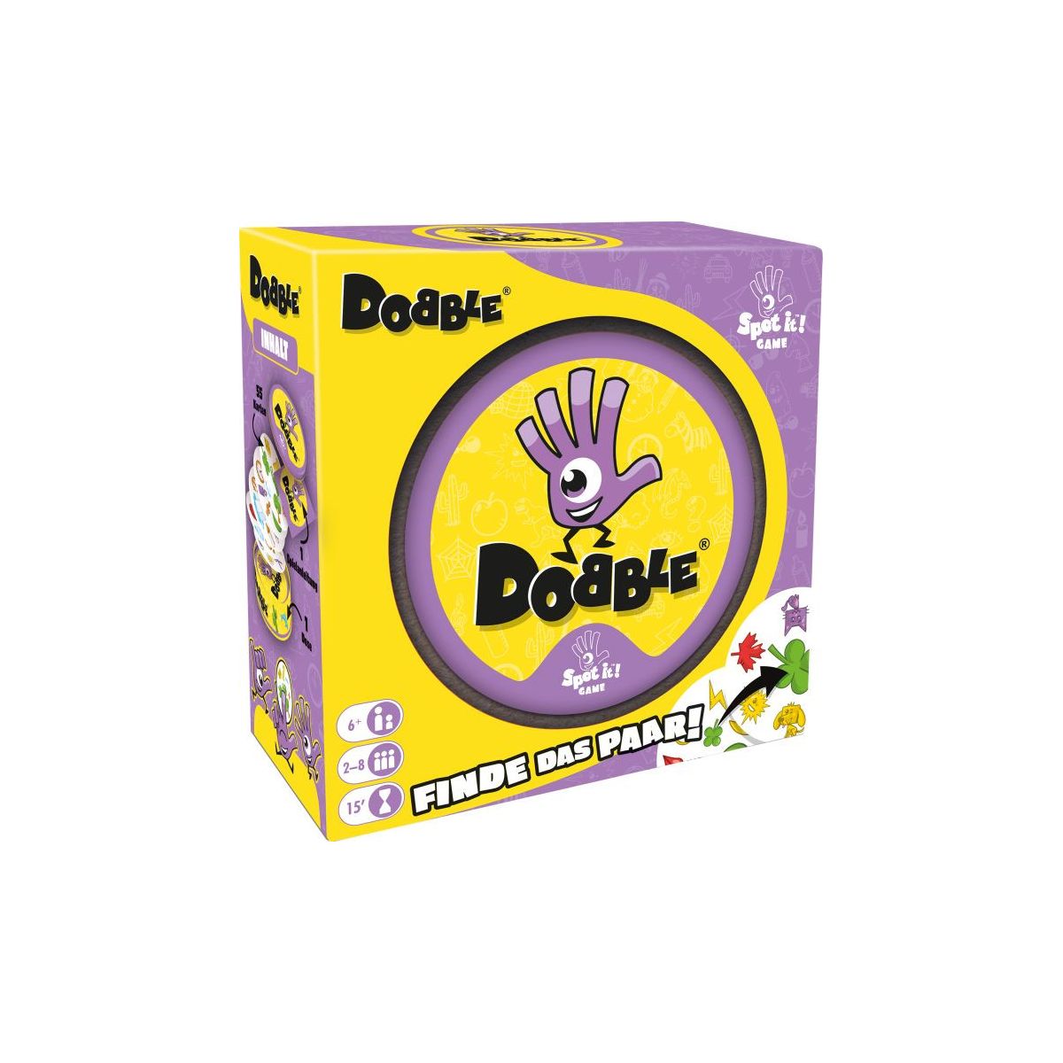 In Dobble gibt es 50 verschiedene Symbole, verteilt auf 55 Karten. Und jede Menge Spielmöglichkeiten. Zum Beispiel: Jeder Spieler hat einen Kartenstapel vor sich und eine Karte liegt in der Mitte. Dann decken alle Spieler gleichzeitig eine Karte auf. Wenn Sie jetzt als Erster ein Symbol entdecken, dass Sie auf Ihrer Karte haben und dass auch auf der Karte in der Mitte abgebildet ist, müssen Sie es nur benennen, und Sie dürfen Ihre Karte in die Mitte legen. Dann beginnt die nächste Runde. Wer als erster seine Karten los ist , hat gewonnen. Glauben Sie bloß nicht, das wäre banal! Ein lustiges Beobachtungs- und Reaktionsspiel für die ganze Familie und lustige Spielerunden. Für 2-8 Spieler. Ab 6 Jahren..