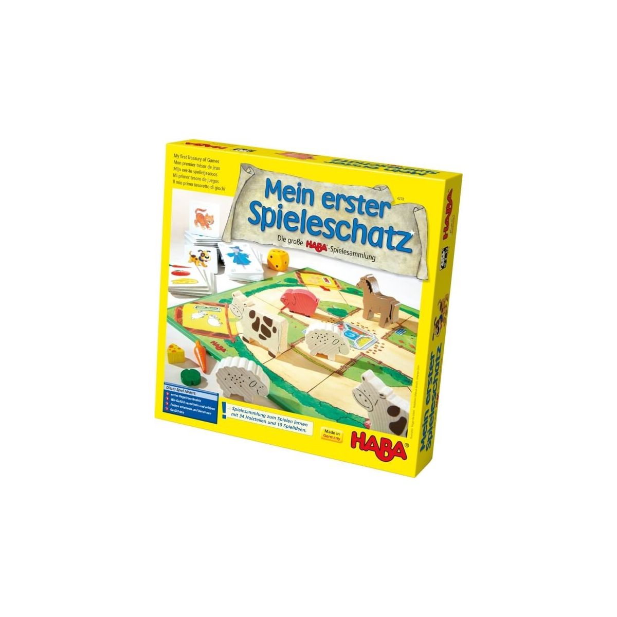 Die große Spielesammlung von HABA: Mein erster Spieleschatz. Das ist abwechslungsreicher Spielspaß für Kinder ab 3 Jahre in einer Box ? darunter spannende Brettspiele zum Laufen und Sammeln, knifflige Memospiele für Gedächtniskünstler und kurzweilige Kartenspiele. Beliebte Spieleklassiker kindgerecht aufbereitet und vereinfacht sorgen hier für einen Einstieg in die Welt der Regelspiele. Wer unterstützt Bauer Bert am besten? Wer findet die leckersten Sachen auf dem Markt? Das zauberhafte Spielmaterial mit detailreichen Illustrationen und vielen niedlichen Tierfiguren aus Holz lädt alle Kinder ein zu großem Spielspaß mit der ganzen Familie..