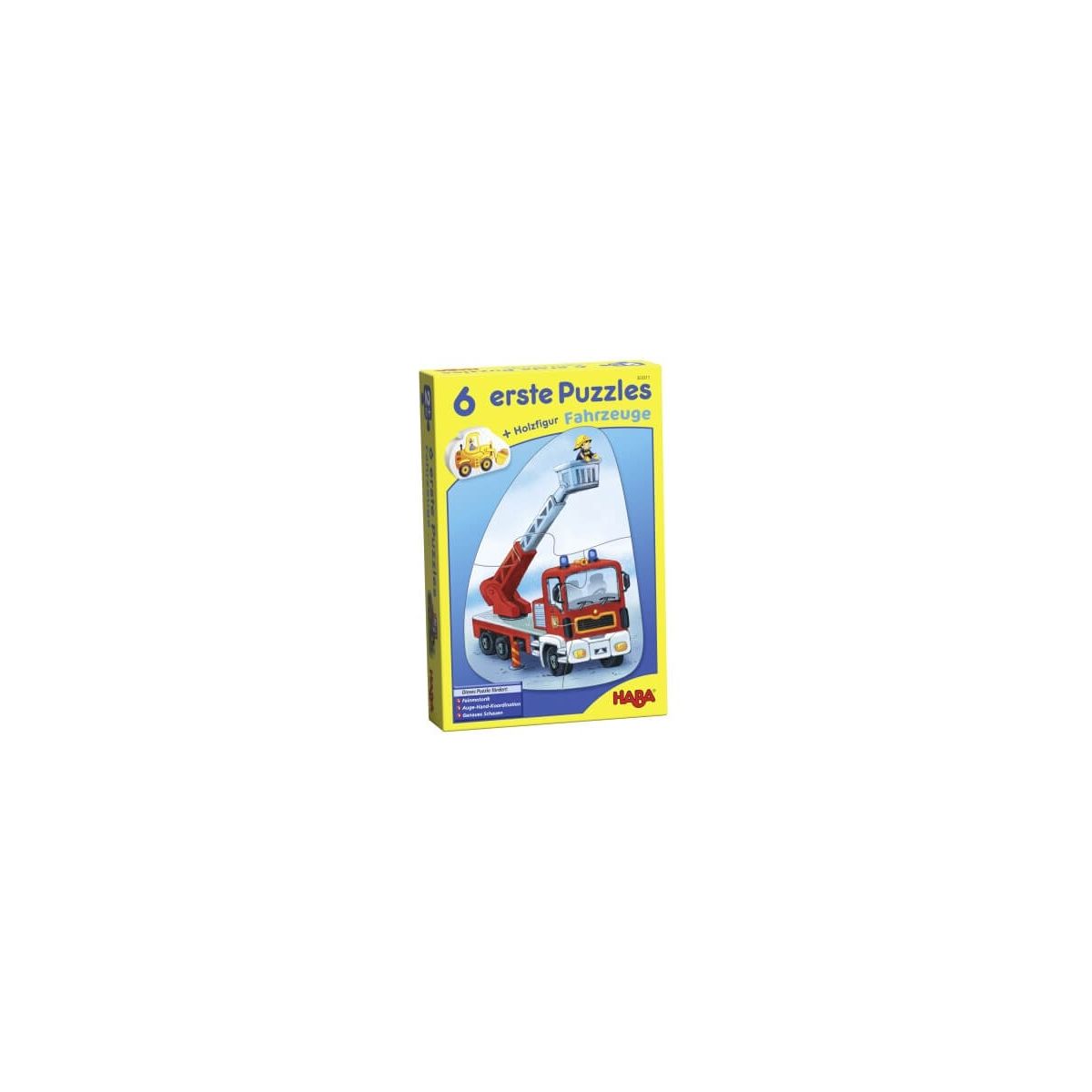 Die spannenden Puzzles ?Fahrzeuge? aus der Puzzlereihe ?6 erste Puzzles? von HABA animieren Kinder ab 2 Jahren zum Puzzeln. Sie zeigen Feuerwehr- und Polizeiauto, Traktor, Radlader, Kipper sowie Rennwagen jeweils mit ihren Fahrern. Die wenigen, stabilen und großen Teile sind schon von den Kleinsten kinderleicht zu greifen. Ihre großzügigen Aussparungen passen gut ineinander. Inklusive Bildkärtchen zu den Puzzles und einer Radlader-Holzfigur zum freien Spielen. So trainieren kleine Fahrzeugfans genaues Schauen, Auge-Hand-Koordination und Feinmotorik. Die 6 ersten Puzzles von HABA sind ein perfekter Einstieg in die große Welt des Puzzelns..