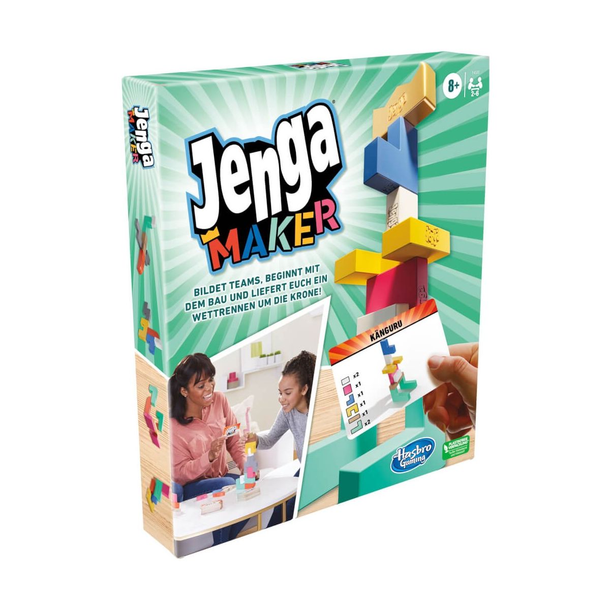Bildet Teams, beginnt mit dem Bau und liefert euch ein Rennen um die Krone. Das Jenga Maker Spiel ist eine spannende, lustige Edition des klassischen Jenga Spiels. Die Spieler bilden Teams und versuchen, vor den Anderen ihr Jenga Objekt mit den Jenga Hartholz-Klötzen fertigzustellen. Ein Teammitglied beschreibt das auf der Karte abgebildete Bauwerk. Die Anderen versuchen, dieses anhand der Beschreibung so schnell wie möglich zu vollenden und zu krönen. Aufgepasst! Wenn ein Team das Bauwerk falsch baut oder das Objekt einstürzt, muss es von vorne beginnen. Das erste Team, das 3 Bauwerke fertigstellt und krönt, hat gewonnen. Es ist ein lustiges, anspruchsvolles Spiel, bei dem Freunde, Fähigkeiten, Spannung, Spaß und etwas Glück kombiniert werden. Auf der Suche nach einem tollen Spiel für einen Familien-Spieleabend? Die Bauwerke für Anfänger und Fortgeschrittene machen Jenga Maker zu einem idealen Spiel für Erwachsene und Kinder ab 8 Jahren. Jenga is a registered trademark of Pokonobe Associates. Hasbro Gaming and all related trademarks and logos are trademarks of Hasbro, Inc..