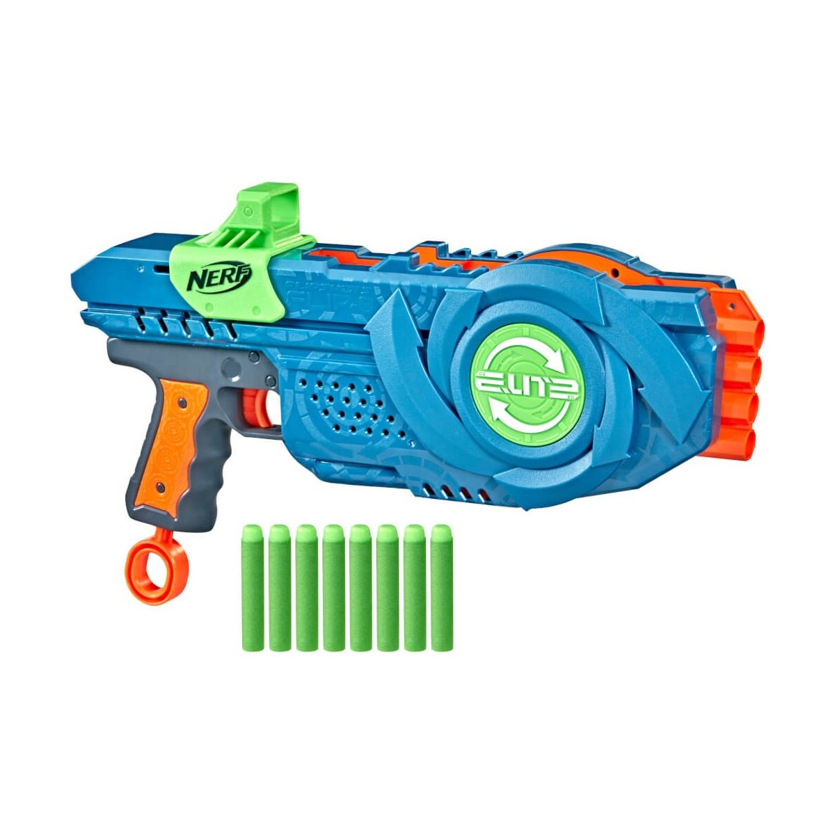 Der Nerf Elite 2.0 Flipshots Flip-8 Blaster sorgt für actionreiche Battles! Der Blaster hat 8 Läufe – 4 zeigen nach vorne und 4 nach hinten. Es können Darts aus den 4 nach vorne zeigenden Läufen abgefeuert werden, anschließend können die 4 nach hinten zeigenden Läufe vorgeklappt werden, um weiterzufeuern. Wenn die Mitspieler denken, die Läufe seien leer, können sie mit 4 weiteren geladenen Läufen überrascht werden. Die in unterschiedliche Richtungen zeigenden Läufe sind miteinander verbunden, sodass sie einfach gedreht werden können, indem das Visier zurückgezogen wird. Das Visier oben am Blaster dient außerdem als Klappmechanismus. Es kann zurückgezogen werden, um die Läufe zu drehen. Jeder Lauf enthält 1 Dart, sodass der Blaster eine Kapazität von 8 Darts hat. Der Griff wird zum Spannen des Blasters nach unten gezogen und der Abzug gedrückt, um 1 Dart abzufeuern. Enthält 8 offizielle Nerf Elite 2.0 Darts aus Schaumstoff. Eine Brille wird empfohlen (nicht enthalten). Manuell. Nerf and all related properties are trademarks of Hasbro..