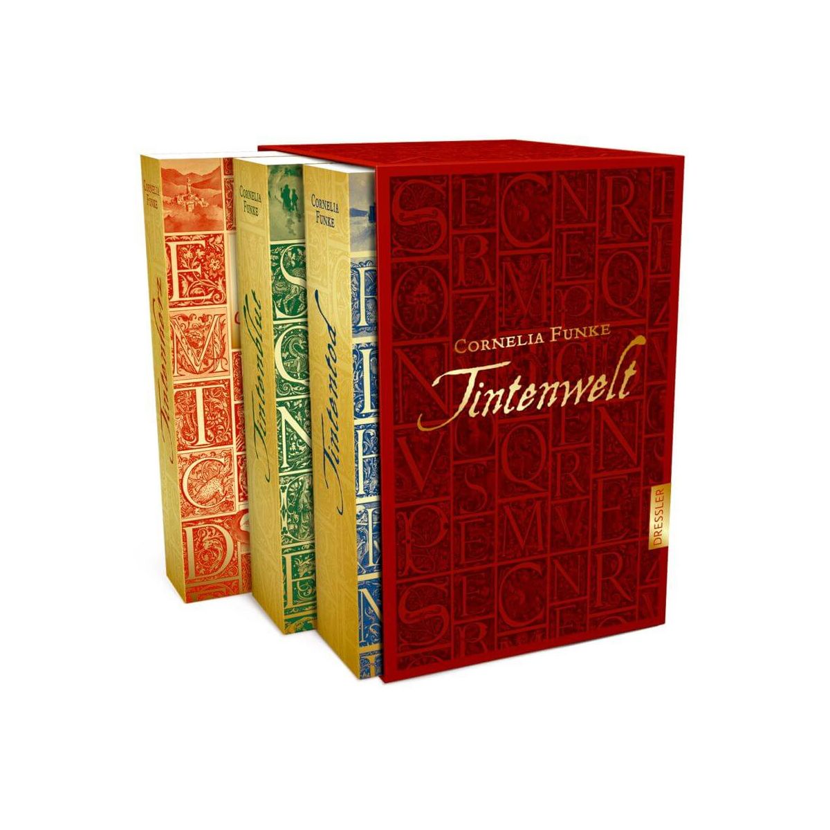 Der Welterfolg im prachtvollen Schuber. In einer stürmischen Nacht taucht ein unheimlicher Gast bei Meggie und ihrem Vater Mo auf. Er warnt Mo vor einem Mann namens Capricorn. So beginnt das unglaubliche, magische und atemberaubende Abenteuer um ein Buch, das Tintenherz heißt und das Meggie, Mo und ihre Freunde in die zauberhafte, wunderschöne und grausame Tintenwelt führt. Cornelia Funkes »Tintenwelt«-Trilogie ist ein Welterfolg, vielfach preisgekrönt und für das Kino verfilmt. Ein meisterhaftes Erzählwerk voll überbordender Fantasie, schaurig-schöner Spannung, eine Liebeserklärung an das Buch, erzählt in Funkes einzigartig bildhafter Sprache. Die neugestaltete Taschenbuch-Gesamtausgabe vereint die kompletten Romane Tintenherz, Tintenblut und Tintentod nun erstmals in einem attraktiven Schmuckschuber mit Goldfolie: das perfekte Geschenk für kleine und große Funke-Fans..