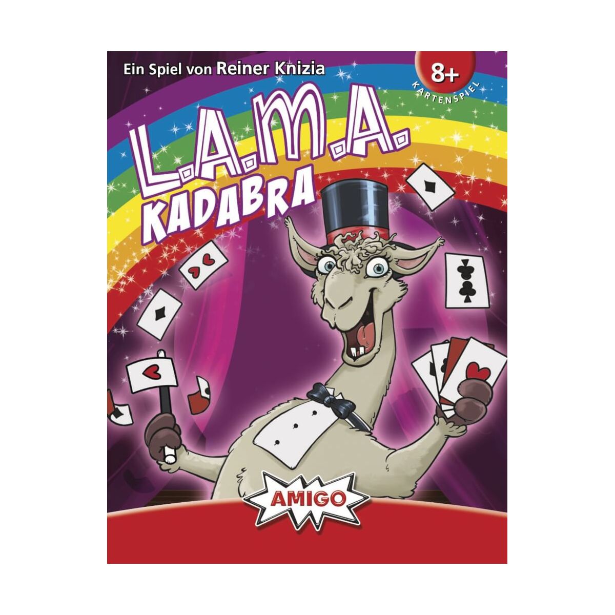 LAMA Kadabra MBE3 Das Lama greift tief in die Trickkiste. Auch hier gilt: Lege Alle Minuspunkte Ab! Doch jetzt können sich die Spielenden auch gegenseitig die Minuspunkte-Chips zuschieben. Dabei helfen das geschickte Einsetzen der Sonderkarten und des magischen Chips, um so den Mitspielenden die besten Zauberkünste zu zeigen! Das neue Spiel aus der Reihe des ''lässigen'' Kultspiels LAMA. So spielt man LAMA Kadabra MBE3: * Ihr erhaltet jeweils sechs Handkarten und drei 1er-Chips. * Wer an der Reihe ist, legt eine Karte ab. Diese muss gleich oder um eins höher sein als die oberste Karte des Ablagestapels. * Ihr könnt auch eine Karte nachziehen oder passen und damit aussteigen. * Manche Karten haben eine zusätzliche Sonderaktion, mit der man Chips weitergibt, den magischen Chip erhält, etc. * Auf die Zauberbühne legt ihr beim Spielen von LAMAs Chips, die eine Person später kassiert. Davor kann man sich mit dem magischen Chip retten. * Legt eine Person alle Karten ab, kassieren alle anderen für ihre übrigen Karten Minuspunkte in Form von Chips und die Runde endet. * Nach mehreren Runden gewinnt, wer die wenigsten Minuspunkte hat. Inhalt: * 60 Karten * 70 Chips * 1 Zauberbühne * 1 Spielanleitung Maße: 12,2 x 9,4 x 2 cm Autor: Reiner Knizia Grafik: Rey Sommerkamp Erfolgsfaktoren: * Das neue Spiel in der LAMA-Reihe * Neue taktische Möglichkeiten bei von LAMA bekannter Grundidee * Mitbringspiel für Groß und Klein.