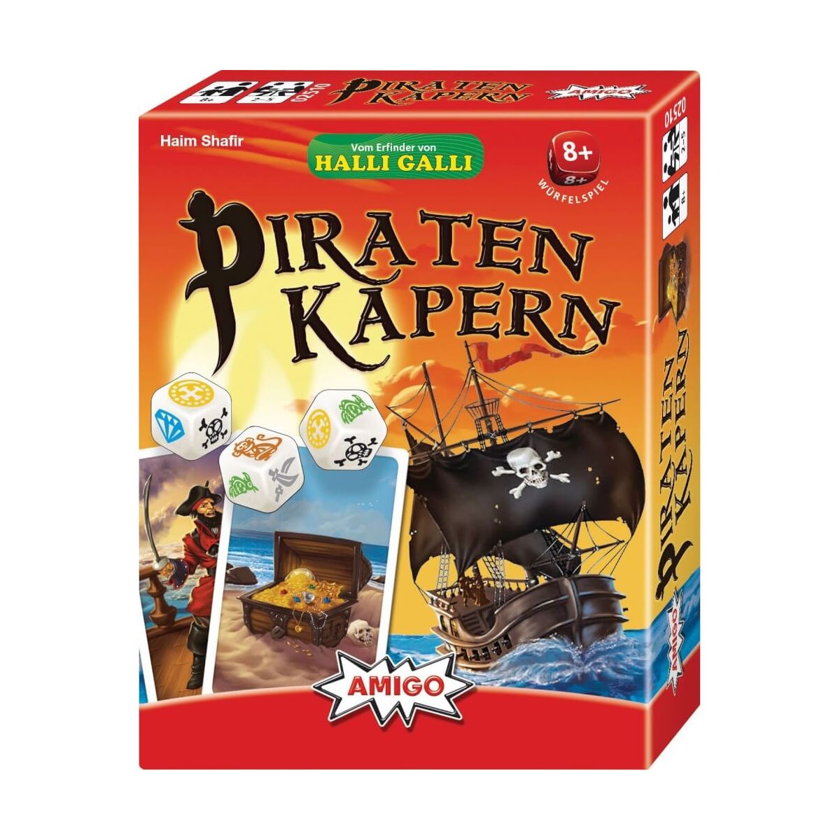 Piraten Kapern MBE3 Einmal im Jahr treffen sich die wildesten Piraten der sieben Meere auf der Totenkopfinsel. Beim abendlichen Würfelspiel erzählen sie sich die neuesten Geschichten und geben mit ihren tollsten Kaperfahrten an. Schlüpft in die Rolle der Piraten und deckt eine Piratenkarte auf. Versucht mit Würfelglück und Piratenlist möglichst wertvolle Kombinationen zu würfeln. Je wertvoller die Kombination, desto mehr Punkte könnt ihr euch aufschreiben. Wer als Erster 6000 Punkte erreicht, gewinnt. So spielt man Piraten Kapern MBE3: * Mischt die Piratenkarten und legt sie als Nachziehstapel in die Tischmitte. * Teilt euch jeweils eine Übersichtskarte aus. Auf dieser könnt ihr sehen, welche Würfelkombinationen es gibt und wie viele Punkte diese wert sind. * Bist du am Zug, deckst du die oberste Piratenkarte auf. Sie kann dir Bonuspunkte, aber auch Minuspunkte einbringen. * Du darfst in deinem Zug mehrmals würfeln, wobei jeder Wurf aus mindestens zwei Würfeln bestehen muss. Totenköpfe darfst du nicht mehr neu würfeln. * Du bekommst Punkte für gleiche Symbole. Diamanten und Goldmünzen bringen Extrapunkte. * Du musst deinen Zug freiwillig beenden, bevor du den dritten Totenkopf würfelst, sonst erhältst du keine Punkte. * Punkte für einzelne Würfel und Kombinationen zählt ihr zusammen und notiert sie. * Die erste Person, die 6000 Punkte oder mehr erreicht, gewinnt. Inhalt: 40 Piratenkarten 8 Kaperwürfel 1 Punkteblock 1 Spielanleitung Maße: 12,4 x 9,7 x 3,2 cm Autor: Haim Shafir Grafik: Jose Pardo Erfolgsfaktoren: * Einzigartige Kombination aus Würfel- und Kartenspiel * Vom Erfolgsautor Haim Shafir (Halli Galli).
