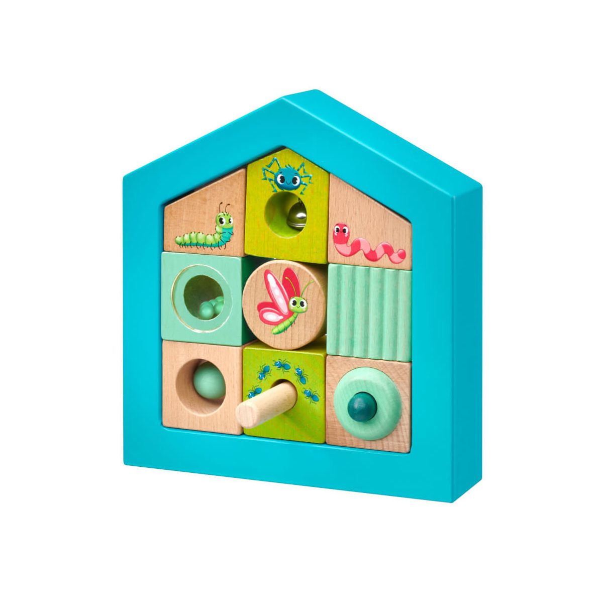 In diesem 11-teiligen Insektenhotel aus massivem Buchenholz gibt es jede Menge zu entdecken – lustige Krabbler und spannende Geräusche. Bauen, Sehen, Hören und Tasten – liebevolle Details und interessante Spielelemente sorgen für Abwechslung und regen die Sinne an. Mal klingelt ein Glöckchen, mal ertönt eine Quietsche oder es rasseln Perlen – unterschiedliche Klangeffekte schulen das Gehör und die Wahrnehmung. Die verschiedenen Sinnesbausteine können in den robusten Rahmen einsortiert oder zum fantasievollen Bauen und Spielen verwendet werden. Die Entdeckersteine „Insektenhotel sind mit den Holzbausteinen „Gewächshäuser und dem Steckspiel „Blumen kombinierbar und bieten dadurch erweiterbaren Spielspaß.
