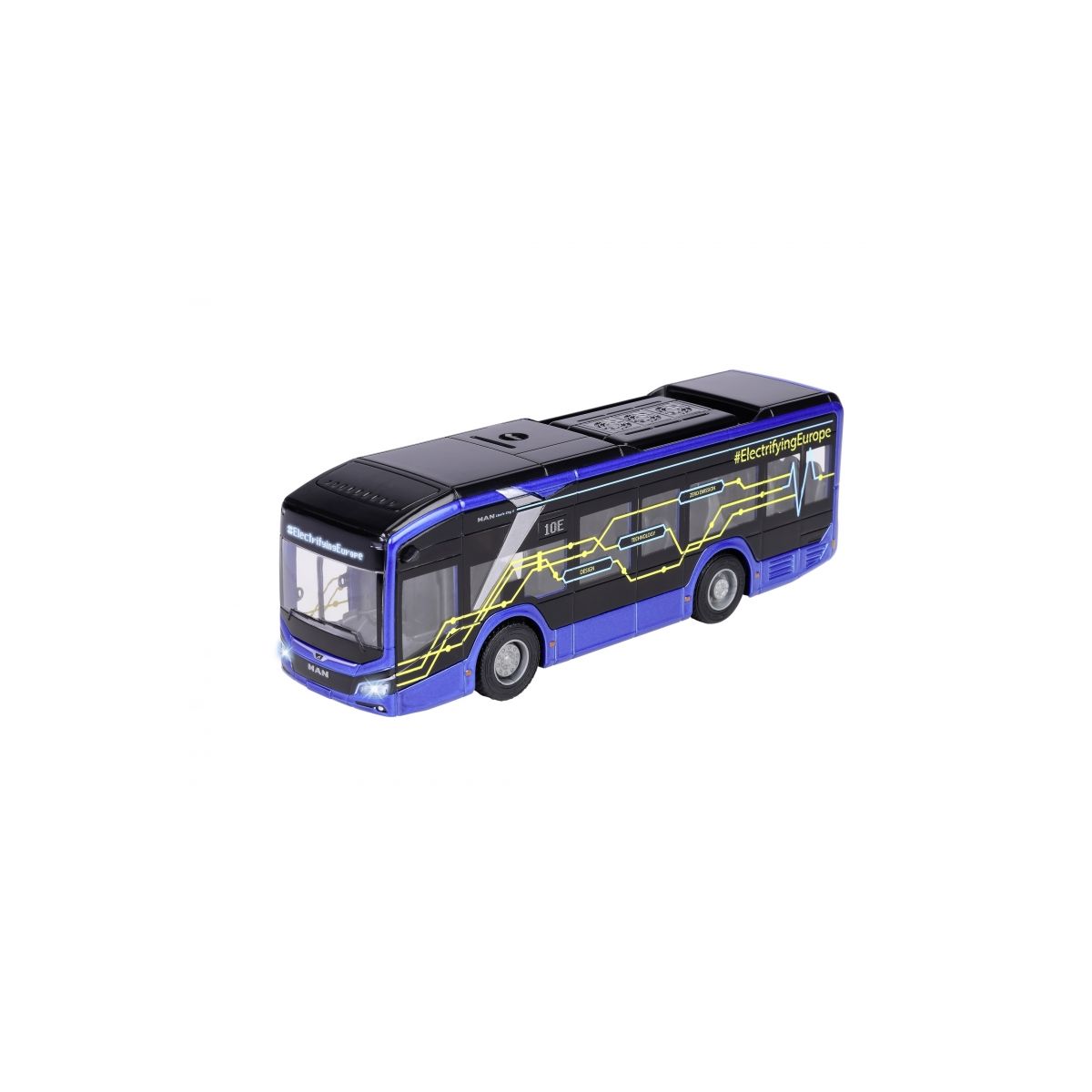 Majorette - MAN Lion s City 10 E Bus (22,5 cm) - Linienbus für Kinder ab 3 Jahre, Spielzeugauto mit Metall-Karosserie, Gummireifen, Licht & Sound, inkl. Batterien • Elektrobus-Modell - Alles einsteigen bitte! Sobald die Seitentüre geschlossen ist, startet der Spielzeug-Bus seine Fahrt zur nächsten Haltestelle und wird dabei per Freilauf über den Boden gerollt. • Echter MAN Bus - Der 22,5 cm lange Spielzeugbus ist eine lizenzierte Nachbildung des vollelektrischen MAN Lion s City 10 E Stadtbus-Modells, der in Originalgröße europaweit seine Runden dreht. • Liebe zum Detail - Der blaue E-Bus für Kinder ab 3 Jahren wurde sowohl innen als auch außen realitätsgetreu gestaltet und ist dank Metall-Karosserie und stabiler Gummiräder voll funktionsfähig. • Licht & Sound - Mit Front- & Scheinwerfer-Lichtern sowie Sound-Effekten (inkl. Batterien) eignet sich der hochwertige Autobus als Modellauto für Sammler ebenso wie als Spielzeug für Kinder. • Majorette - Als einer der bekanntesten Hersteller von Modellfahrzeugen kombinieren wir Tradition mit Innovation - seit 1964. Unsere Modelle zeichnen sich durch ihre erstklassige Verarbeitung aus. MAN Lion s City 10 E: Die Zukunft der Mobilität als detaillierter Spielzeugbus Die lizenzierte Nachbildung des vollelektrischen MAN Lion s City 10 E Busses beweist, wie beeindruckend umweltfreundliche Verkehrsmittel sein können: Das 22,5cm-große Omnibus-Modell, das als Stadtbus europaweit im Einsatz ist, präsentiert sich in stilvollem blau-schwarzen Design mit modernem Interieur. Doch das Bus-Spielzeug wurde nicht nur zum Anschauen entwickelt, sondern ist mit einer robusten Metall-Karosserie und hochwertigen Profil-Gummireifen ausgestattet – um echte Fahrabenteuer zu erleben! Mit dem Bus die Spielzeugstadt erkunden Die zu öffnende Seitentüre lädt die Kinder dazu ein, Spiel-Figuren in den Bus einsteigen zu lassen und die Passagiere durch das Kinderzimmer zu transportieren. Dabei können die Kids ihre eigenen Fahrten im öffentlichen Nahverkehr nachspielen oder kreative Geschichten erfinden. Die Licht- & Sound-Effekte (inkl. Batterien) sorgen dabei für eine realistische und abwechslungsreiche Fahr- & Spiel-Atmosphäre – ideal als Spielauto für Mädchen und Jungen ab 3 Jahren oder Sammler origineller Automodelle. Über Majorette Die Kultmarke aus Frankreich verzaubert seit 1964 Autofans auf der ganzen Welt. Die realitätsgetreuen und original lizenzierten Modelle weltweit bekannter Automarken sind besonders hochwertig und widerstandsfähig. Von PKWs, Monstertrucks, Einsatz- und Baufahrzeugen bis hin zu Rennautos. Majorette bietet eine riesige Auswahl an Spielzeugautos aus Metall sowie dazu passende Parkhaus-Spielsets zu verschiedenen Themenbereichen. Die kleinen Spielzeugautos aus Metall sind ideal für Kinder ab 3 bzw. 5 Jahren und ambitionierte Sammler jeden Alters..