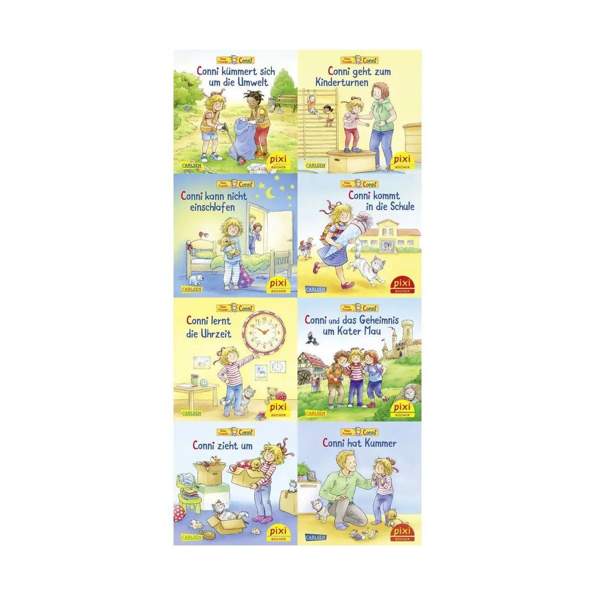 Conni begleitet Kindergartenkinder durch alle Erfahrungen im Kinderalltag. Es geht mit Conni zum Kinderturnen und in die Schule. Große Gefühle wollen gemeistert werden, wenn Conni nicht einschlafen kann, Kummer hat oder umzieht. Zum Glück ist Kater Mau an ihrer Seite! In der Filmgeschichte „Conni und das Geheimnis um Kater Mau verreist er sogar mit Conni. Unverzichtbare Geschichten für jedes Kindergartenkind. In der Pixi-Serie Neue Abenteuer mit Conni sind folgende Bücher enthalten: • Conni kann nicht einschlafen • Conni lernt die Uhrzeit • Conni kommt in die Schule • Conni geht zum Kinderturnen • Conni zieht um • Conni und das Geheimnis um Kater Mau • Conni kümmert sich um die Umwelt • Conni hat Kummer.