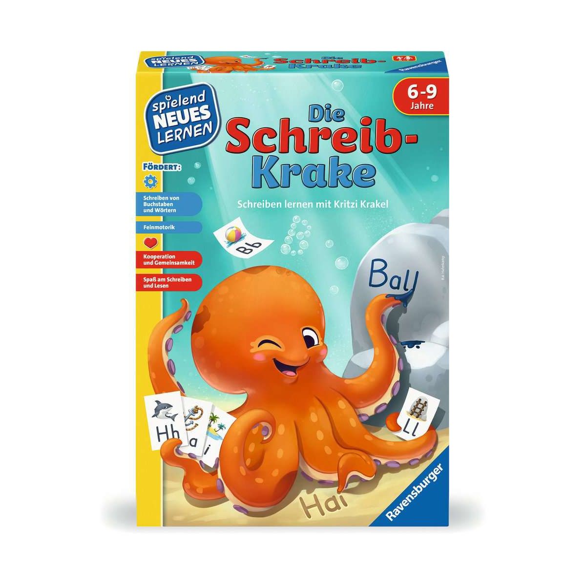 Oje, fast hätte Kritzi Krakel vergessen, seine Schreibübung an die Klassenlehrerin zu schicken. Und welcher Tentakel war doch gleich sein richtiger Schreibarm? Bei diesem lustigen Spiel zum Schreibenlernen zielen die Kinder mit einem ?Tintenklecks? auf Buchstaben-Kärtchen und schreiben so die Wörter auf den Schreibvorlagen nach. Wem gelingt dies zuerst? In der kooperativen Variante versuchen alle gemeinsam, die Vorlagen auszufüllen, bevor die Flaschenpost schließt.?Spielend Neues Lernen? unterstützt die Entwicklung der Kinder. Sie erwerben spielerisch Wissen und können persönliche Potentiale entfalten. Außerdem erlauben unterschiedliche Schwierigkeitsgrade und Selbstkontrollmechanismen individuelles und eigenständiges Lernen..