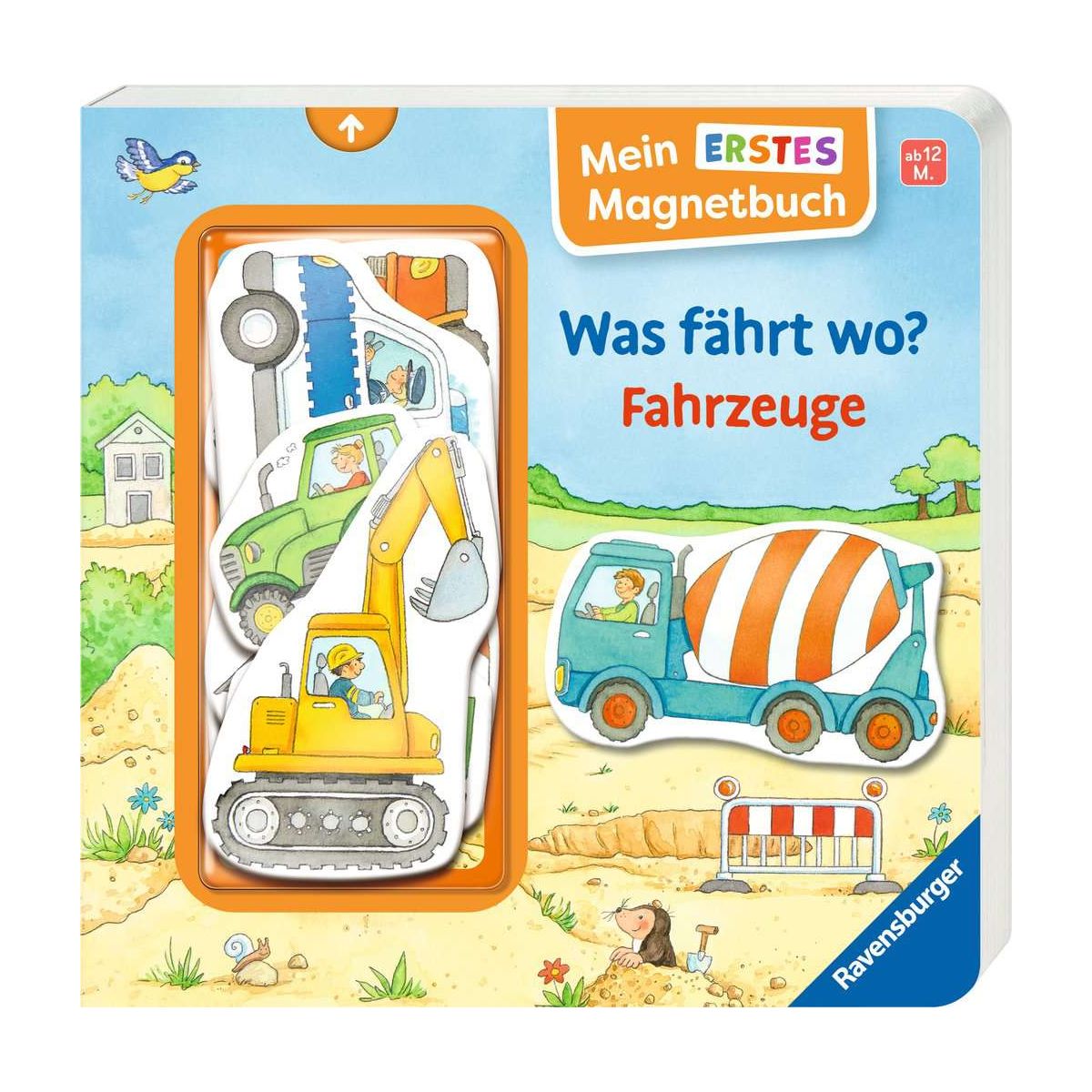 Welches Fahrzeug fährt wohin?Der Traktor ist auf dem Feld unterwegs. Doch wo ist der Anhänger für das Korn? Und wer kommt da mit lautem Tatütata angefahren? In diesem Spielbuch können Kinder ab 12 Monaten sechs verschiedene Fahrzeug-Magnete auswählen und in die passende Szene setzen. Das animiert zum Zuordnen und freien Spiel. Die großen Magnete sind auch für kleine Kinderhände leicht zu greifen. Bagger, Betonmischer, Müllauto, Polizei und Traktor mit Anhänger: Aus diesen großen und stabilen Magnetteilen können Kleinkinder ab 1 Jahr das passende Fahrzeug aussuchen und ins Bild setzen. Dank der vollflächig magnetischen Seiten kann in diesem Spielbuch aber auch ganz frei gespielt werden. Das fördert Kreativität und Feinmotorik. Die sechs großen und stabilen Magnete haften auch an vielen magnetischen Flächen und können zum Beispiel an Heizung oder Kühlschrank zum Spielen eingesetzt werden.