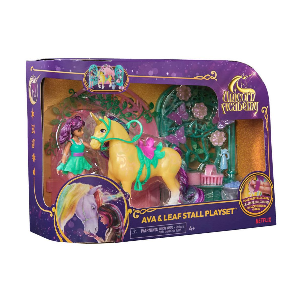 Mit den Ankleidepuppen Sophia, Ava, Isabel, Layla und Valentina (alle separat erhältlich) werden die spannenden Abenteuer der beliebten Netflix-Serie, die auch bei Toggo ausgestrahlt wird, lebendig! Inspiriert von der Animationsserie und der erfolgreichen Buchreihe hat die Firma Spin Master die Charaktere in 24 cm und 12 cm großen Puppen umgesetzt, um die Abenteuer der Lieblingscharaktere lebendig werden zu lassen. Ava zeigt ihre Verbindung zu ihrem Einhorn Leaf mit dem Stall-Spielset! Dieses Set enthält eine 11 cm große Ava-Puppe, das 12 cm große Einhorn Leaf mit Farbwechseleffekt und 15 Zubehörteile, die die Magie der Serie ins Kinderzimmer bringen. True-to-Show-Details wie eine Wand mit buntem Glasfenster und zauberhafte Accessoires wie Blumen, Schmetterlinge und Ranken zum Dekorieren machen das Set zu einem Must-Have. Der Schwamm kann in eiskaltes Wasser getaucht werden - am besten mit Eiswürfeln, um die Pflanzen-Magie-Symbole auf Leafs Körper sichtbar zu machen! Geheimtipp: Wer Leaf vorher kurz ins Gefrierfach legt, entdeckt die Magie besonders deutlich. Zum Spielen lassen sich Leafs Sattel und Zaumzeug abnehmen, ihre farbige Mähne mit der Bürste glänzend machen und die Szene nachstellen, in der Leaf ihre Kräfte entdeckt. Für noch mehr Abenteuer sind auch die anderen kleinen Puppen mit ihren Einhörnern (separat erhältlich) erhältlich..