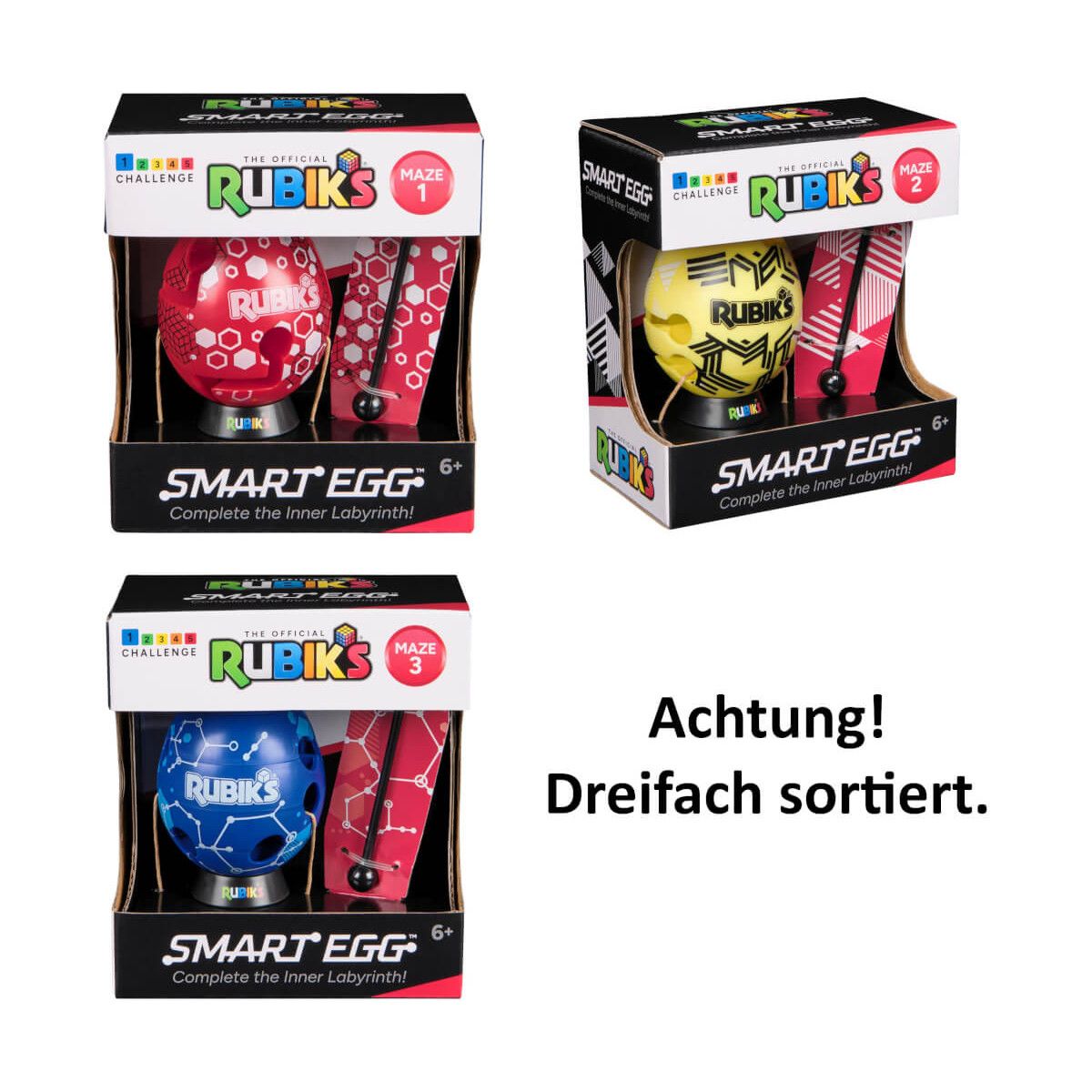 Rubik s Smart Egg - spannendes Labyrinth im Ei. Die Challenge: Der Stab wird ins obere Loch des Eis gesteckt und muss dann vorsichtig, Schritt für Schritt durch das im Ei verborgene Labyrinth geführt werden - bis er aus dem unteren Loch wieder herausgezogen werden kann. Geduldsspiel für Einsteiger: Es trainiert Konzentration und Geschicklichkeit und ist für Groß und Klein ab 6 Jahren geeignet. Die Smart Eggs gibt es nur als Sortierung aus 3 verschieden-farbigen Eiern mit jeweils unterschiedlichen Laybrinthen - allesamt mit gleichem Schwierigkeitsgrad. Der beiliegende Ständer für Ei und Stab ist praktisch zum Aufräumen und Platzieren auf dem Regal. Rubik s Smart Egg - die Geduldsspiel-Challenge für Einsteiger und für zwischendurch..
