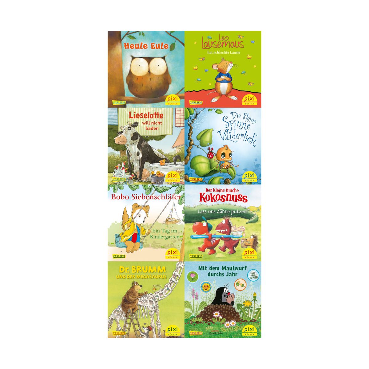 Acht heiß geliebte Bilderbuch-Helden geben sich in dieser Pixi-Serie ein Stelldichein. Und natürlich geht es bei ihnen um Themen, die auch ihre kleinen Fans beschäftigen: Baden, Zähneputzen und sonstige Anlässe für schlechte Laune! Daneben erleben sie kleine und große Abenteuer im Kindergarten bzw. Vorgarten. So viel sei versprochen: Am Ende wird immer alles gut. In der Pixi-Serie Pixis liebste Kinderbuch-Helden sind folgende Bücher enthalten: - Leo Lausemaus hat schlechte Laune - Der kleine Drache Kokosnuss – Lass uns Zähne putzen! - Bobo Siebenschläfer – Ein Tag im Kindergarten - Dr. Brumm und der Megasaurus - Die kleine Spinne Widerlich - Lieselotte will nicht baden - Mit dem Maulwurf durchs Jahr - Heule Eule.