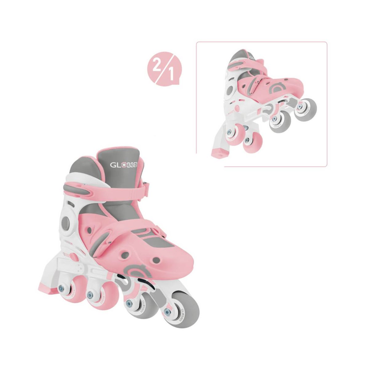 Die LEARNING SKATES 2in1 wecken von Anfang an die Begeisterung fürs Skaten – so werden die ersten Fahrversuche auf vier Rollen zum Kinderspiel. Das drehbare Hinterradmodul ermöglicht einen schnellen, werkzeuglosen Wechsel zwischen Quad-Skate für Lernanfänger und Inline-Skate für Fortgeschrittene. Auf den Quad-Skates stehen die kleinen Profi-Skater stabiler, falls das Fahren noch etwas wackelig ausfällt. Wer sicher fährt, der rollt begeistert auf Inline-Skates um die Wette. - Für eine komfortable und sichere Fahrt sorgen ein robustes Chassis und High Rebound Rollen aus gegossenem PU. Die Rollen haben eine Größe von 54 x 24 mm und ein ABEC 5 Kugellager und sorgen für ein müheloses Dahingleiten. Die LEARNING SKATES 2in1 fördern die motorischen Fähigkeiten des Kindes – Koordination, Gleichgewicht, Ausdauer und Muskelkraft werden bei jeder Übungsrunde verbessert. - Die LEARNING SKATES 2in1 sind schnell mit dem Push Button-System verstellbar von Größe 30 bis 33. Sie wachsen einfach mit und passen sich optimal den Bedürfnissen des Kindes an. Somit ermöglichen die LEARNING SKATES 2in1 eine Menge Fahrspaß über mehrere Jahre und schonen zusätzlich die Ressourcen! - Der weich gepolsterte Innenschuh garantiert hohen Tragekomfort. Zwei praktische und leicht einstellbare Powerstrap-Verschlüsse ermöglichen den kleinen Flitzern einen schnellen Ein- und Ausstieg. Die halbharte Konstruktion des LEARNING SKATES 2in1 liefert notwendige Stabilität in Kombination mit bequemer Passform am Fuß des Kindes. Sicher gebremst wird hinten mit dem strapazierfähigen TPR-Stopper. - Das maximale Benutzergewicht beträgt 60 kg. Der Artikel wird empfohlen für Kinder ab 5 Jahren. Wir als offizieller deutscher Globber-Partner bieten Ihnen einen umfassenden After-Sales-Service an sowie eine große Auswahl an Ersatzteilen unter www.authentic-sports.de..