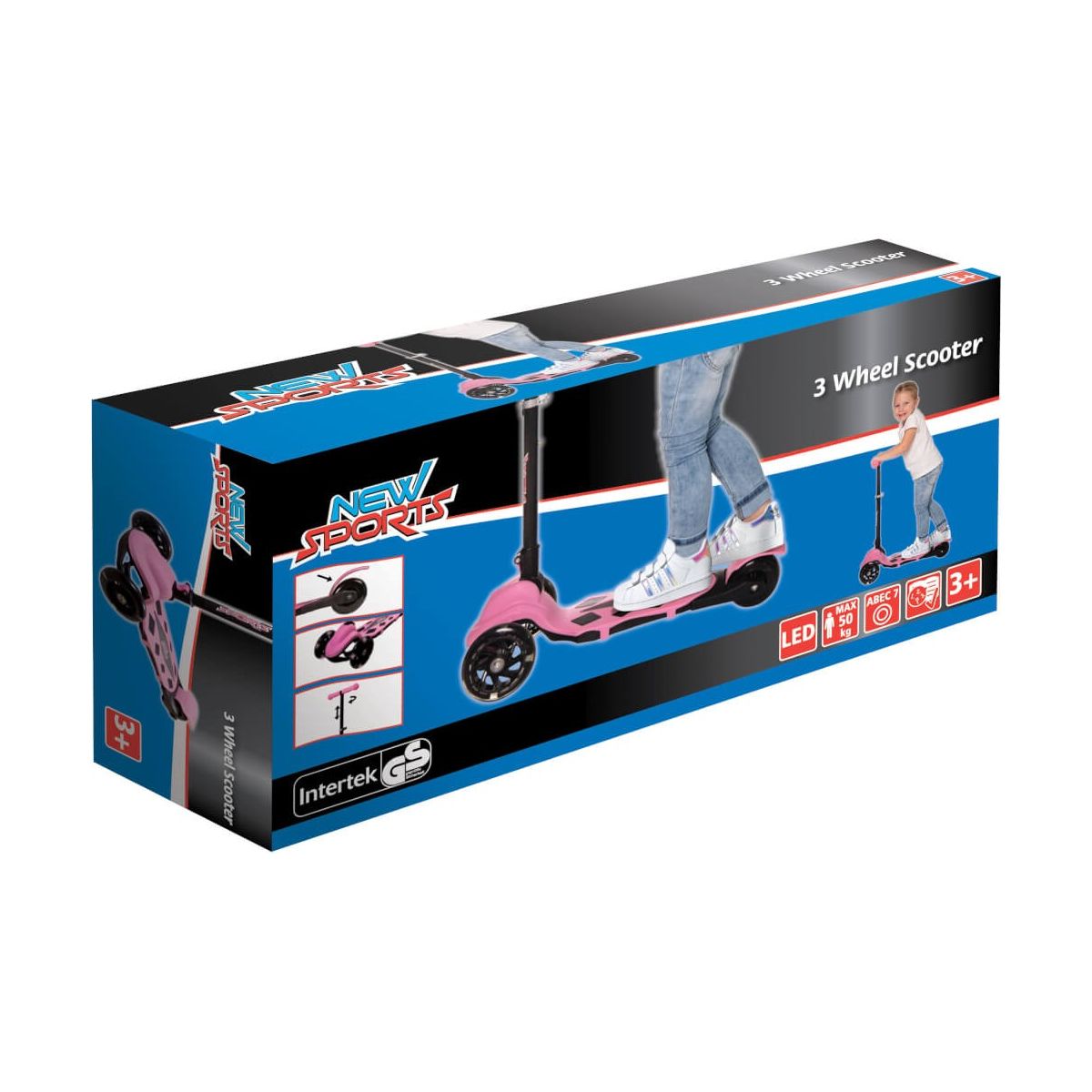 New Sports 3-Wheel Scooter Rosa, klappbar, 120mm. ABEC 7 Kugellager. PU Fronträder. Trittbremse. Klappbar. Maximale Belastung 50 kg. Maße ca. 55x24x66,5cm. Breite des Decks ca. 14cm. Für Kinder ab 3 Jahren..
