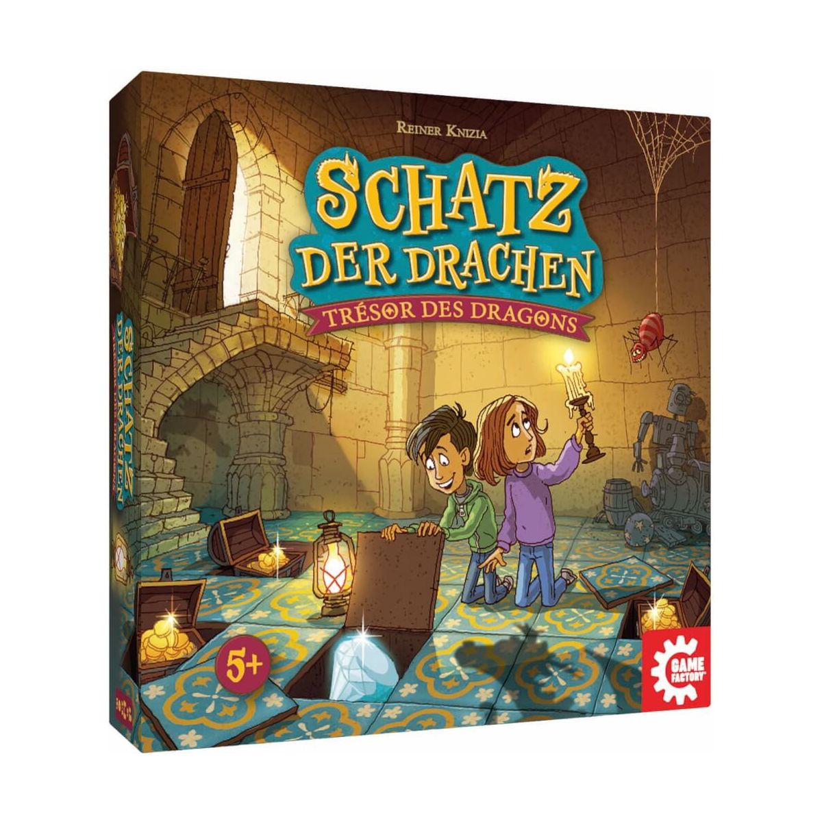 SCHATZ DER DRACHEN von Reiner Knizia ist ein spannendes Kinderspiel für 2-5 Spieler ab 5 Jahren. Bei dem Memo-Spiel mit Twist merken sich die Kinder, wo die wertvollsten Schätze versteckt sind. Wird ein Schatz gefunden, kann man aufhören oder aber in der Hoffnung auf eine noch größere Belohnung weitere Plättchen umdrehen. Dabei ist allerdings Vorsicht geboten – denn auch die feuerspeienden Drachen und fiesen Spinnen lauern unter den Kacheln …